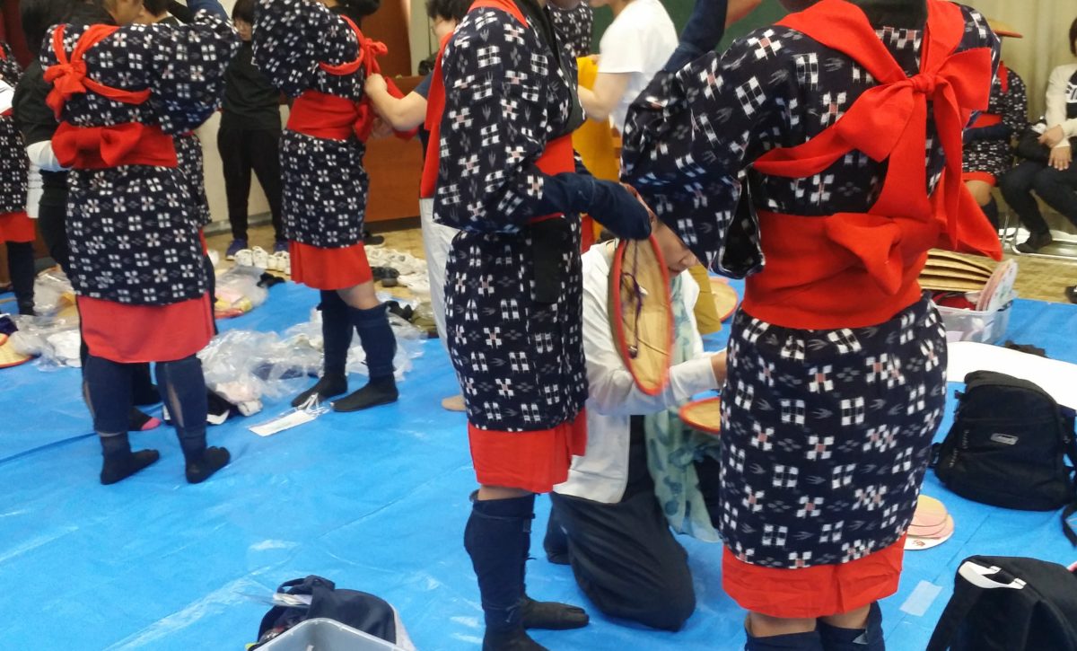 まず、ピタッと足に張り付くゴム製の田植え足袋を履きます。それから、下着姿になって、真っ赤な腰巻をつけます。腰巻→脚絆→着物→帯→襷(たすき)→手甲、最後は手ぬぐいを頭に巻いて傘をかぶって、帯にうちわを挟みます。簡単だけど、慣れていないとなかなか一人ではできません。婦人会の方々が手伝ってくれました。衣装を身に着けるとなりきるのよねー。(何に?)