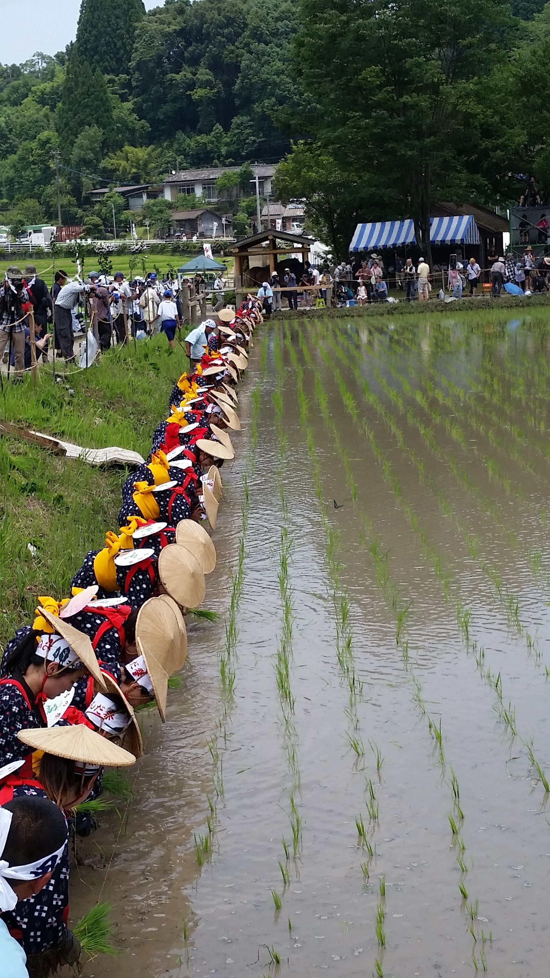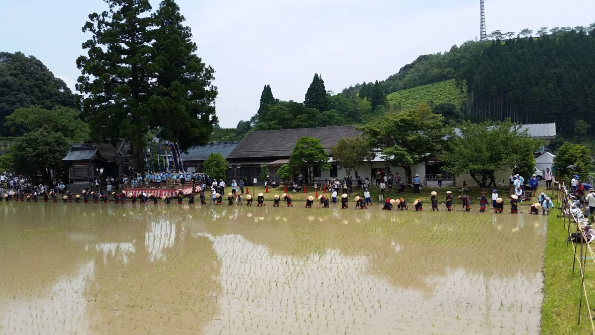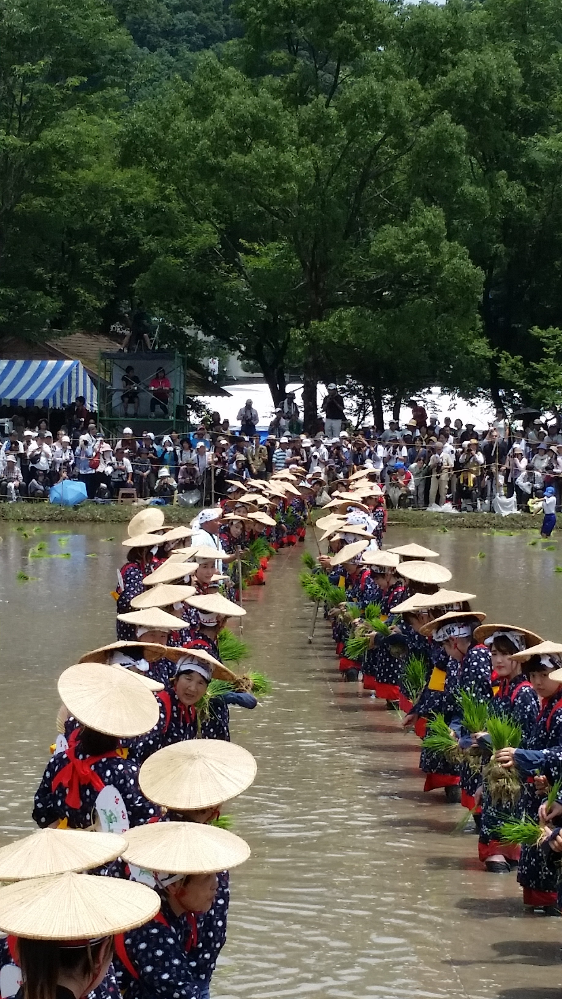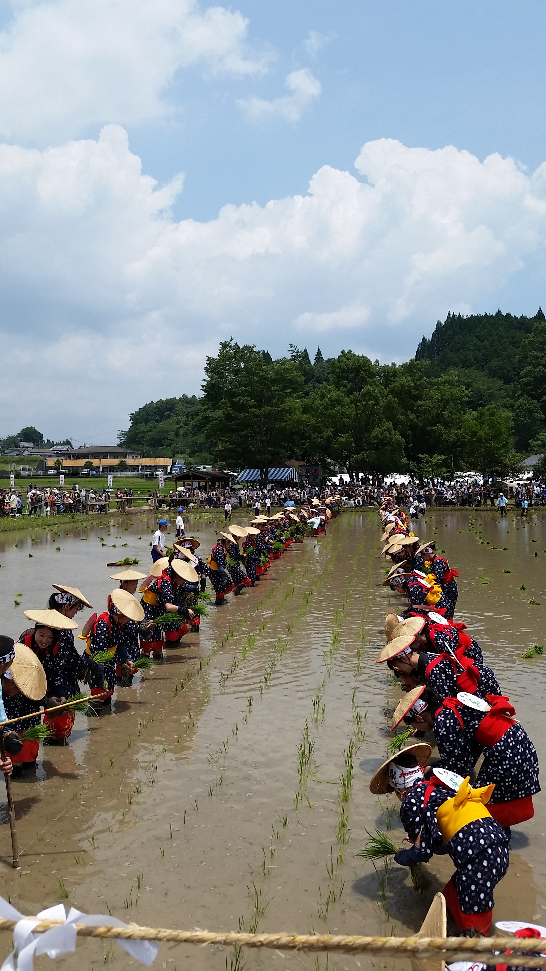 総勢100名以上の人が向かい合って一列に並びます。田植え歌に合わせて、指先から苗をすうっと泥に差し込みます。すると緑の稲の葉が水にのって生き生きと開きます。