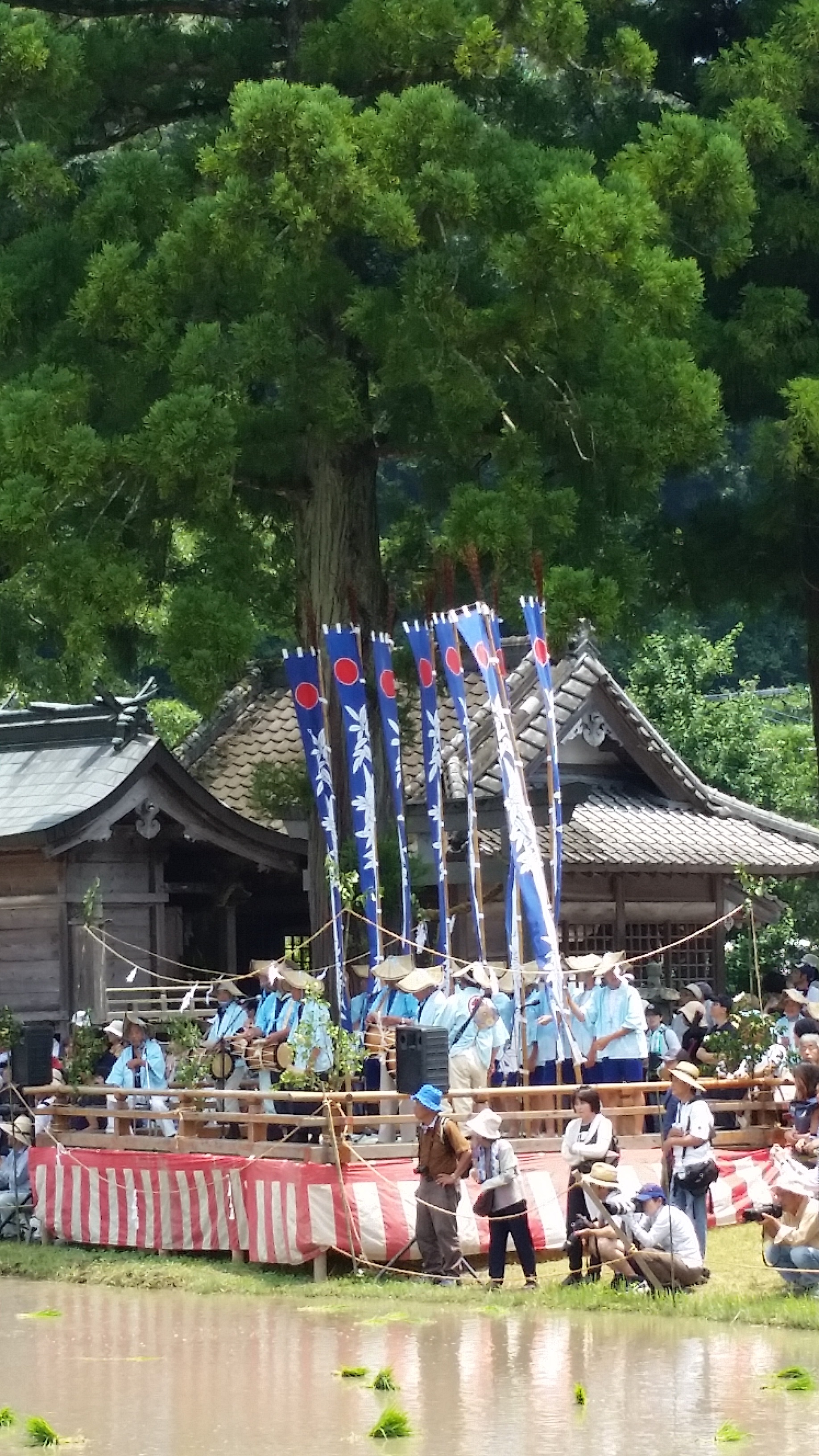 苗を植えるのは手作業。今回、田んぼを目の前にして、これを手で植えるのか~と思っただけで、一瞬腰が痛くなったような気がしました。ところが、神事が始まり田んぼに牛馬が入ると、早く自分も田んぼに入りたいという気持ちが強くなるから不思議です。見物だけしていた時には、感じなかった気持ちだなあ。