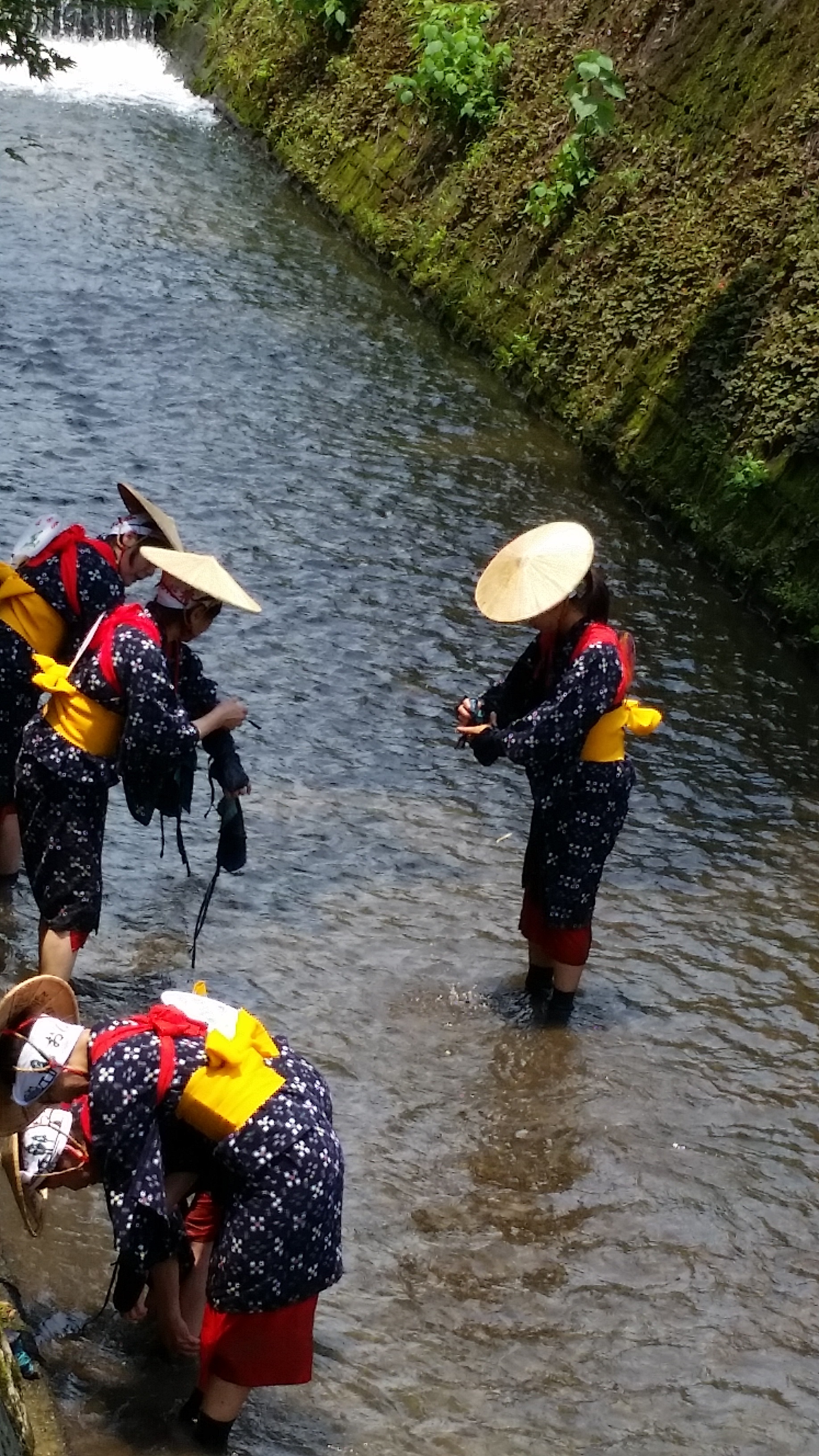 神輿が御神田を一巡して、担ぎ手が大暴れするのは、最近の行事。これがまた盛り上がるの。そして、早乙女たちが田んぼに入ります。みんな、田んぼが華やかになったって溜息交じり!うふふ、もっと私を見てって感じ。