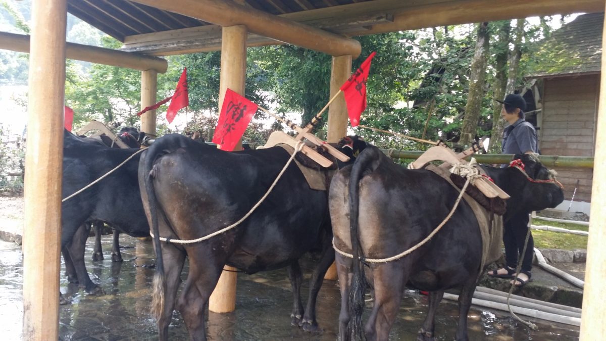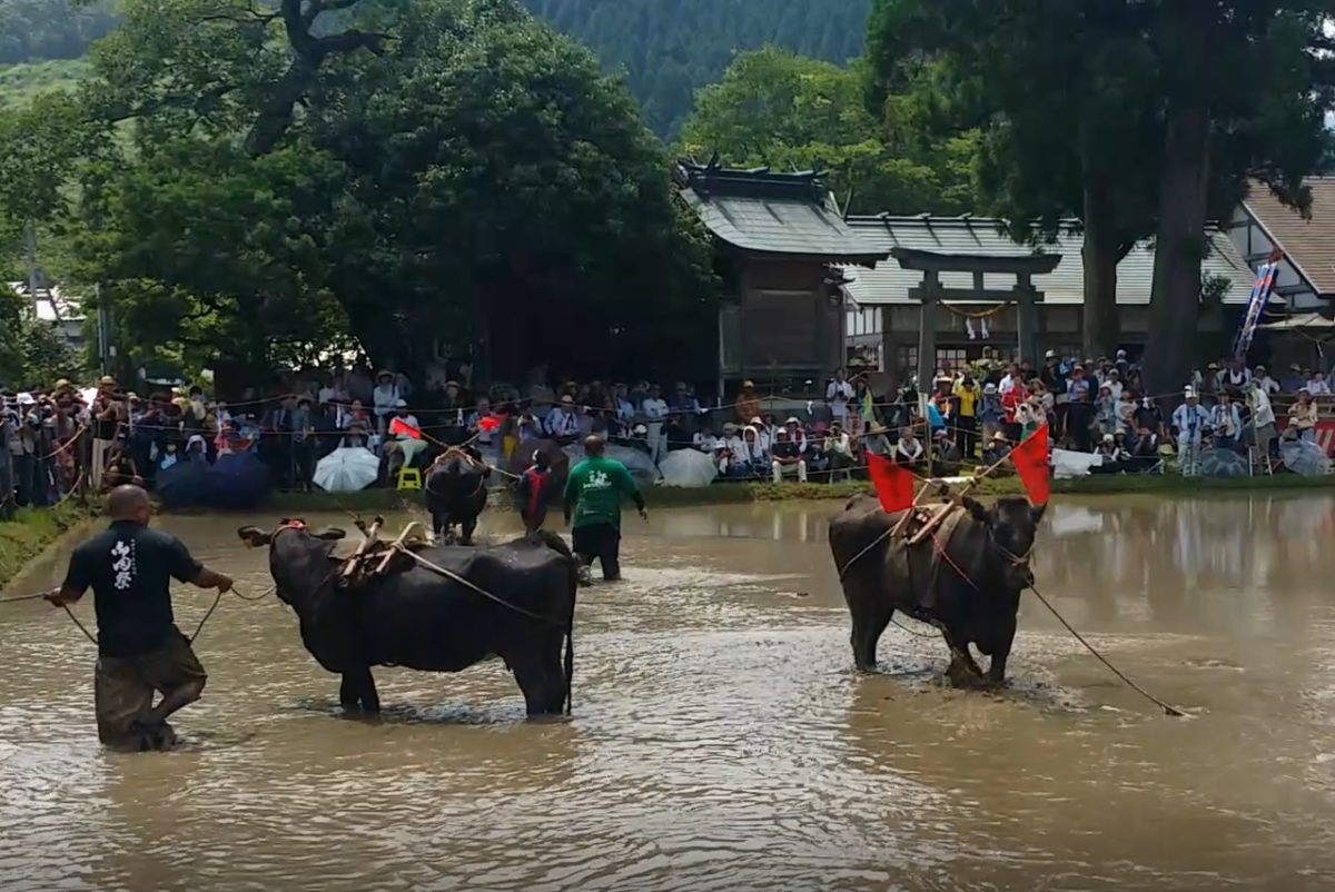 馬と若者の御神田での大暴れが終わると、次は、牛たちです。昔は、この時間帯に、村中の牛や馬が連れてこられたそうです。そして、その健康と安全を祈願して御神田を歩き回ったのでした。農業に携わる家畜は、大切なパートナーですからね。人に馴染んで労働を手伝ってくれた大型の動物。人より力が強いので、反抗しようと思えばできるのに、長い間ずっと過酷な労働を支えてくれた牛や馬。感謝しても感謝しきれません。