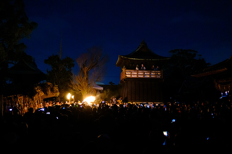 準備が整うと、松明も屋台の照明も、すべての明かりが落とされて神社全体が大きな闇と静寂に包まれます。暗闇の中を奥神殿から出た鬼火が近づき、その刹那、6本の松明に一斉に火が灯されます。