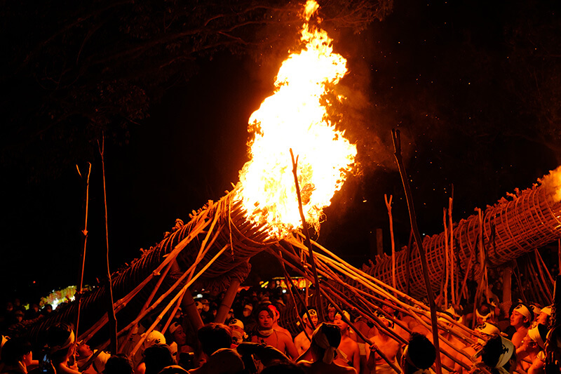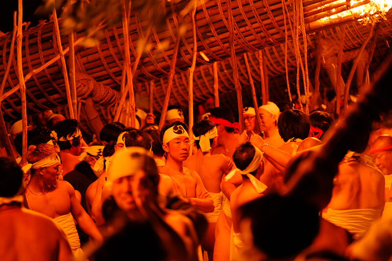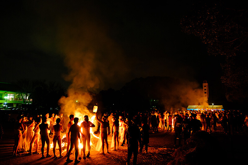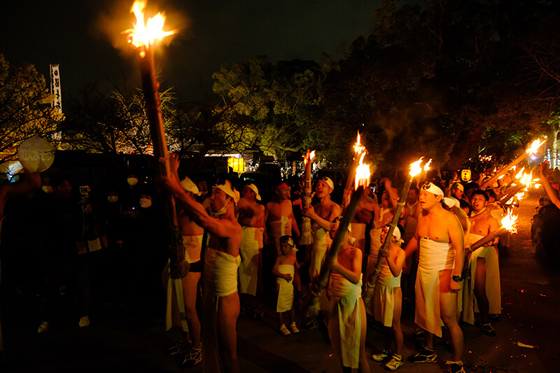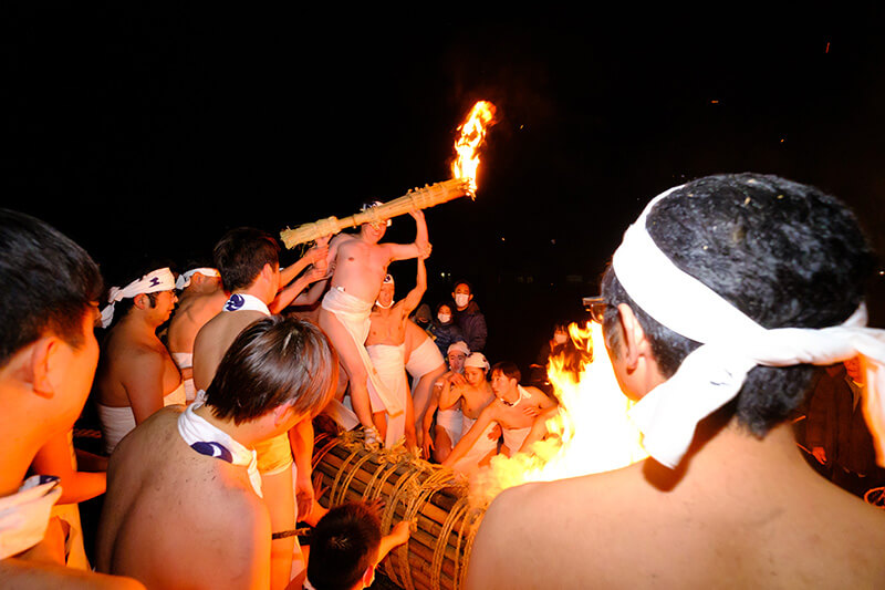 夜の帷(とばり)をつんざくような炎が大松明からあがると、暗闇に包まれていた祭り会場には再び活気が戻ります。裸衆や観衆のボルテージも、この時最高潮に。