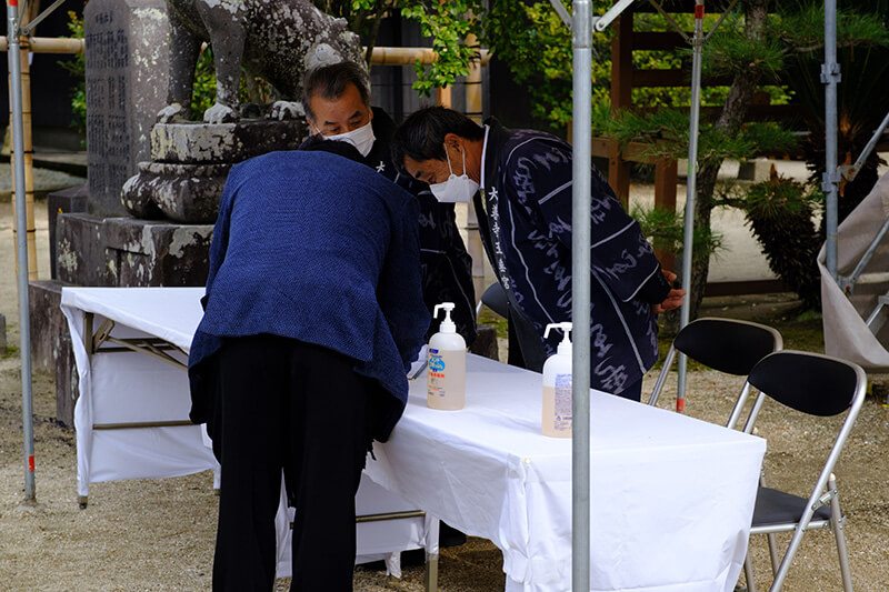 受付など、会場の各所に消毒液を設置。その他、祭りの規模を一部縮小するなど万全の感染対策を施しての開催となります