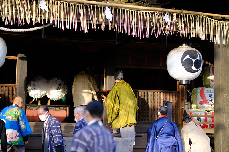 まずは、本殿の中に氏子総代や来賓の関係者が集まり「祭典」が執り行われます。祭りが何事もなく開催されるよう、人々の祈りが捧げられました。