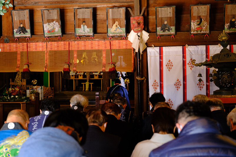 午後4時には「鬼面尊神還御」の神事が行われます。渡御の時とは逆に、鬼堂から本殿へと向かい鬼面尊神をお還しします。
