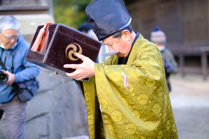 鬼面の納められた漆塗りの箱は、大切に取り扱われます