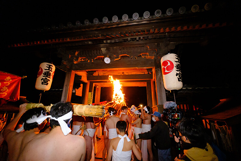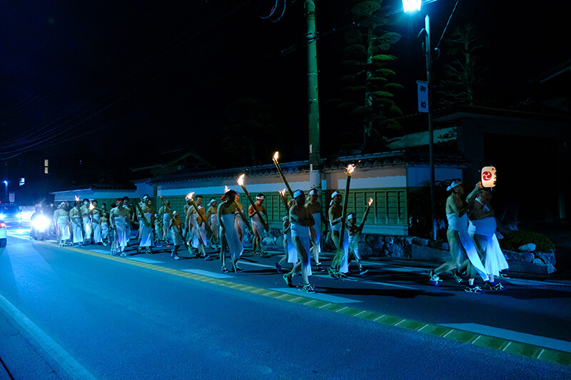 小松明を手にした裸衆(はだかしゅう)の一団が、列になって県道を歩きます。自分たちを鼓舞するかのような叫びが、寒空の中響きます。