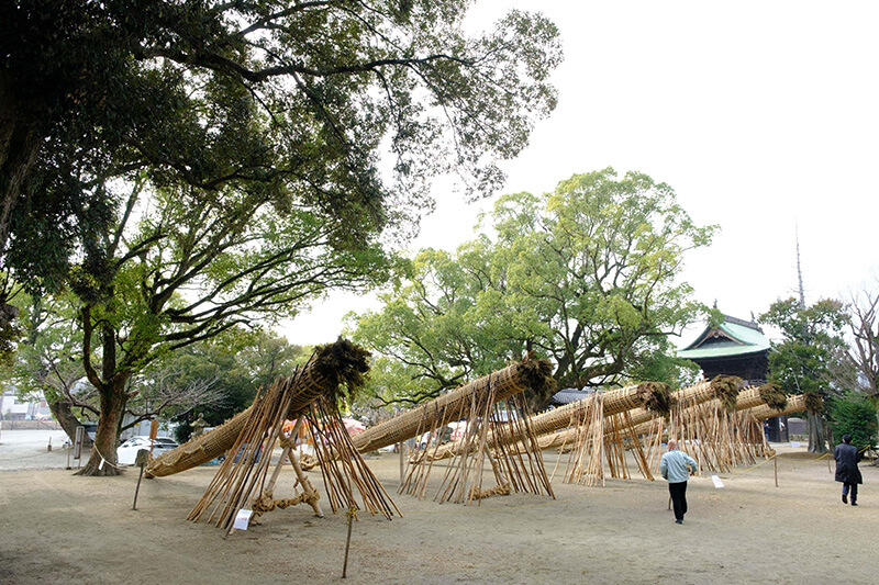 大晦日の夜から1月7日まで続く大善寺玉垂宮の追儺(ついな)行事「鬼会(おにえ)」。その結願神事である「鬼夜」が、3年ぶりに開催となりました。主催者たちの願いが通じたのか、雨もなく穏やかな陽気のもと、お祭り当日を迎えました。朝から着々と準備が進んでいきます。