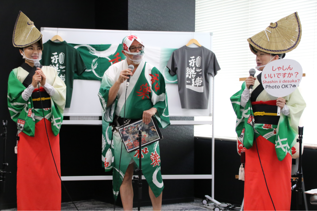 今回ワークショップを担当した「和樂連」は、正調阿波踊りの旋律を守りながら、見る人が踊りたくなるような演出や、参加型イベントに定評がある東京高円寺阿波おどりの担い手。インターナショナルなメンバーが多く所属し、多言語での情報発信にも積極的であることから、今回のオンラインワークショップに出演いただきました。