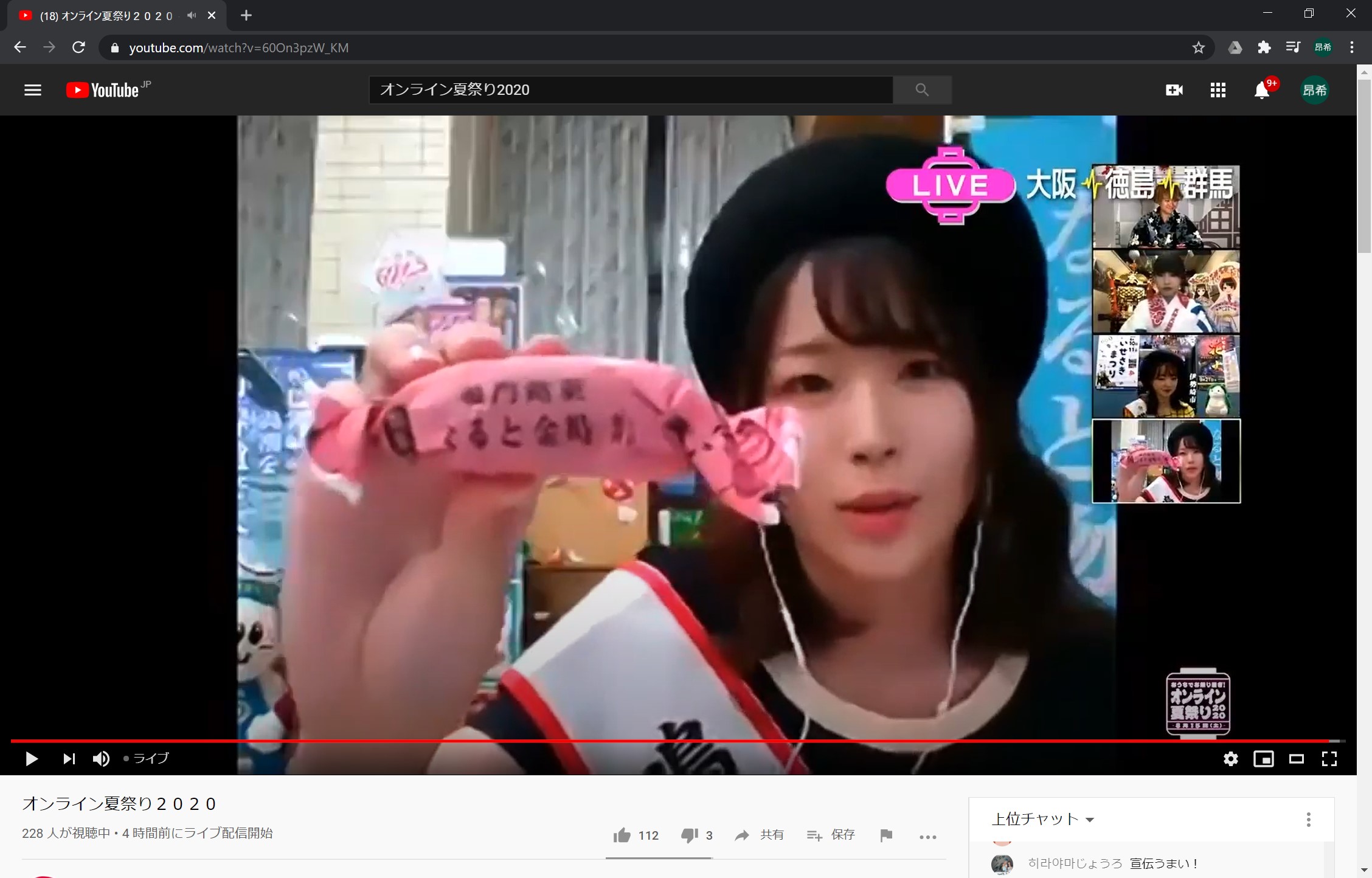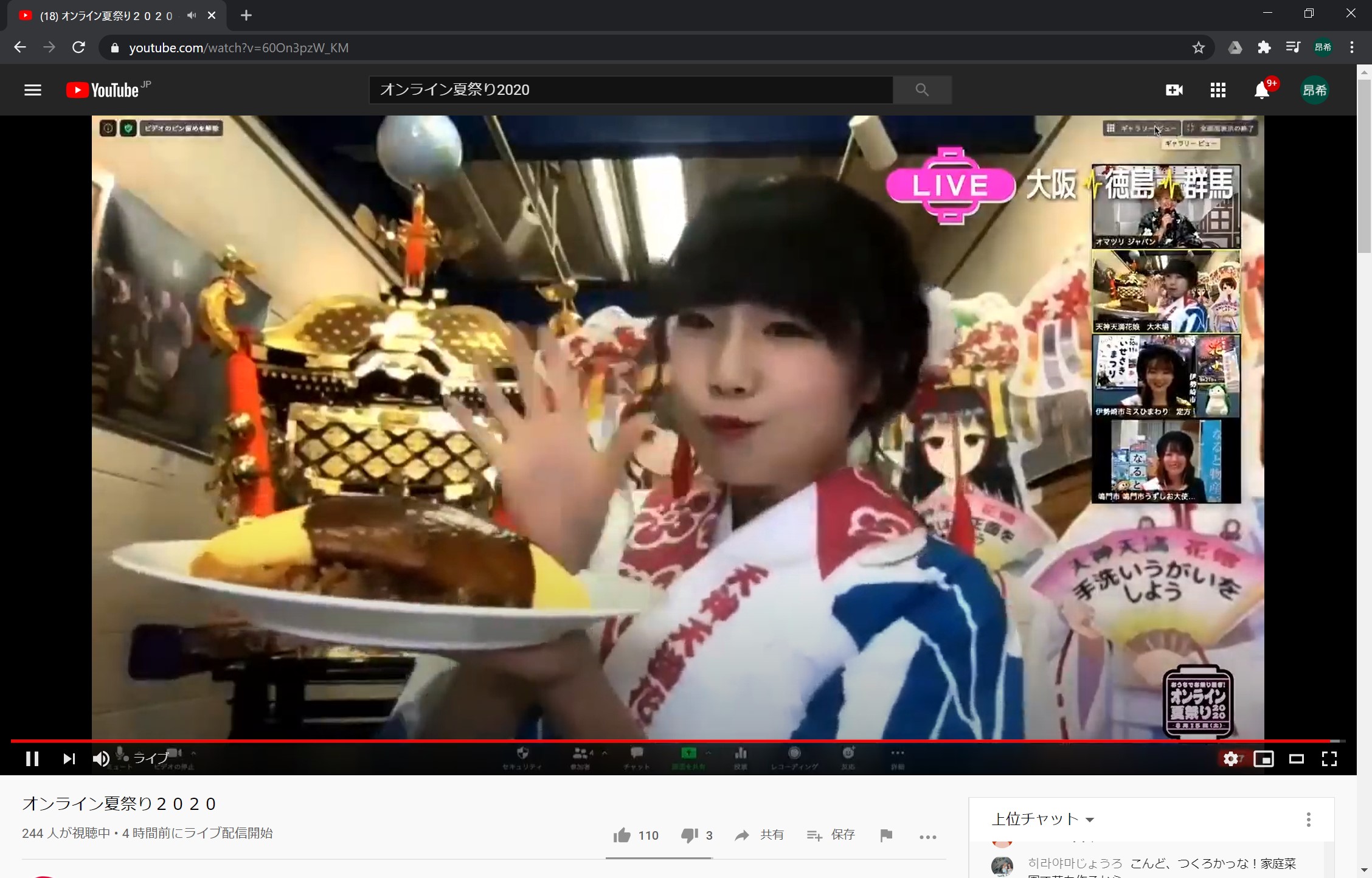 次には配信されたのは、オンライン夏祭り2020のハイライト映像。実はこのハイライト映像、イベントと同時並行で製作された出来立てほやほやの作品。さっきまで行われていたエイサーの場面もしっかり収録されており、ずっと作業をし続けていたスタッフさんの技術力に感服です。