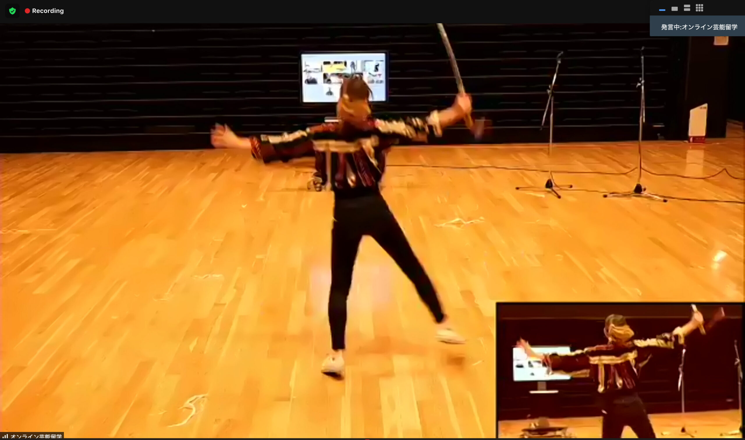 歴史や活動について知ったところで、いよいよ、受講生皆でオンラインで踊り方を習った。今回は「通り(お祝いの席だと祝入)」という名前の演目を習った。シシと刀振りのそれぞれの動きを習い講評をしてもらってから、最後に発表会ということでその練習の成果を披露する流れで行われた。