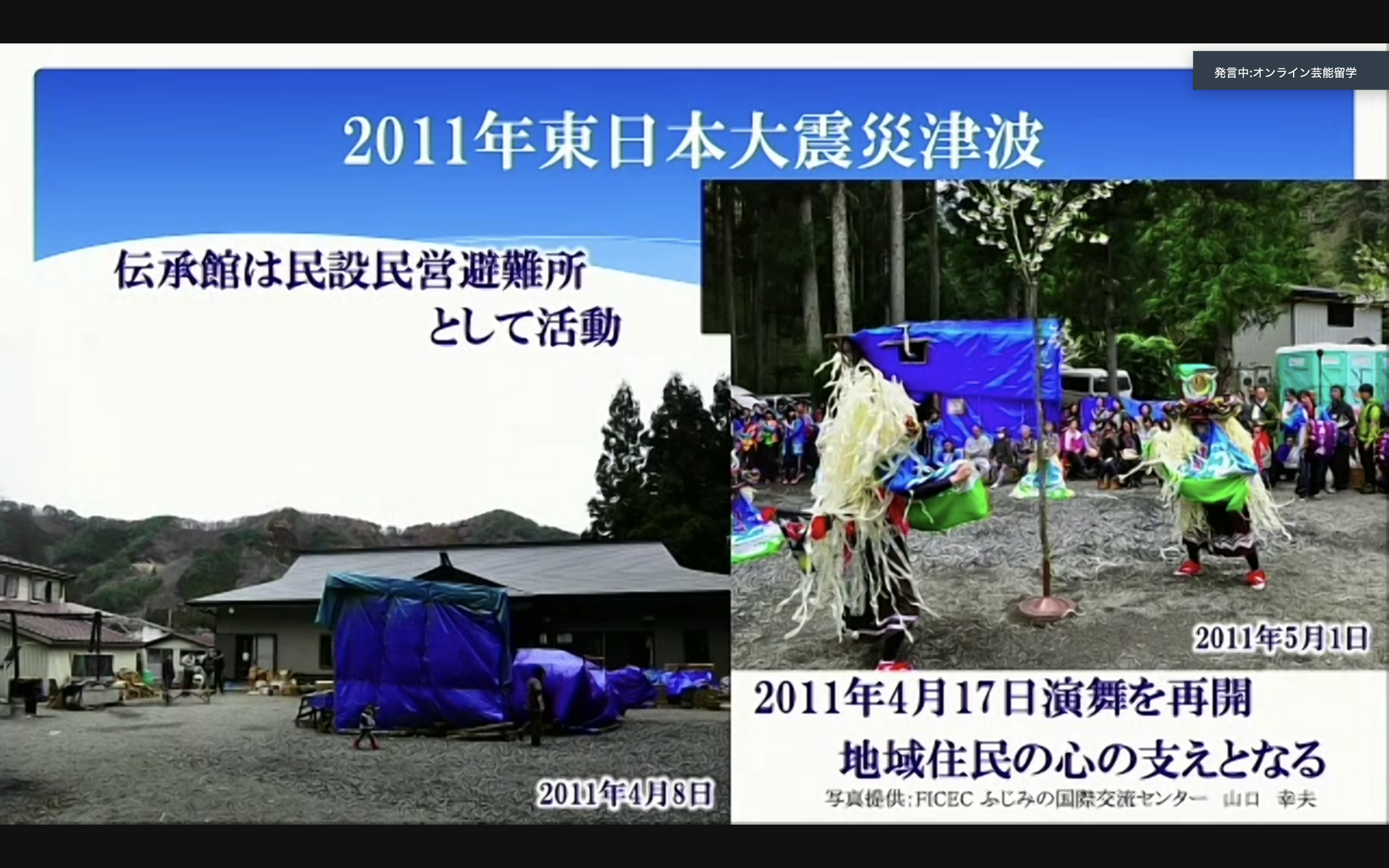 このように三陸芸能短期留学では、遠く離れた場所をオンラインで繋ぎながらも、担い手と受講者が交流し、その踊りが伝承されていくことが実現している。現在、コロナ禍で多くの郷土芸能団体が練習の場をどう確保し、その芸能を次の世代にどう繋いでいくかを考えている。その中で、ZOOMなどのオンラインツールを使って、芸能を次の世代に繋いでいくというのも1つの選択肢であると確信できてよかった。