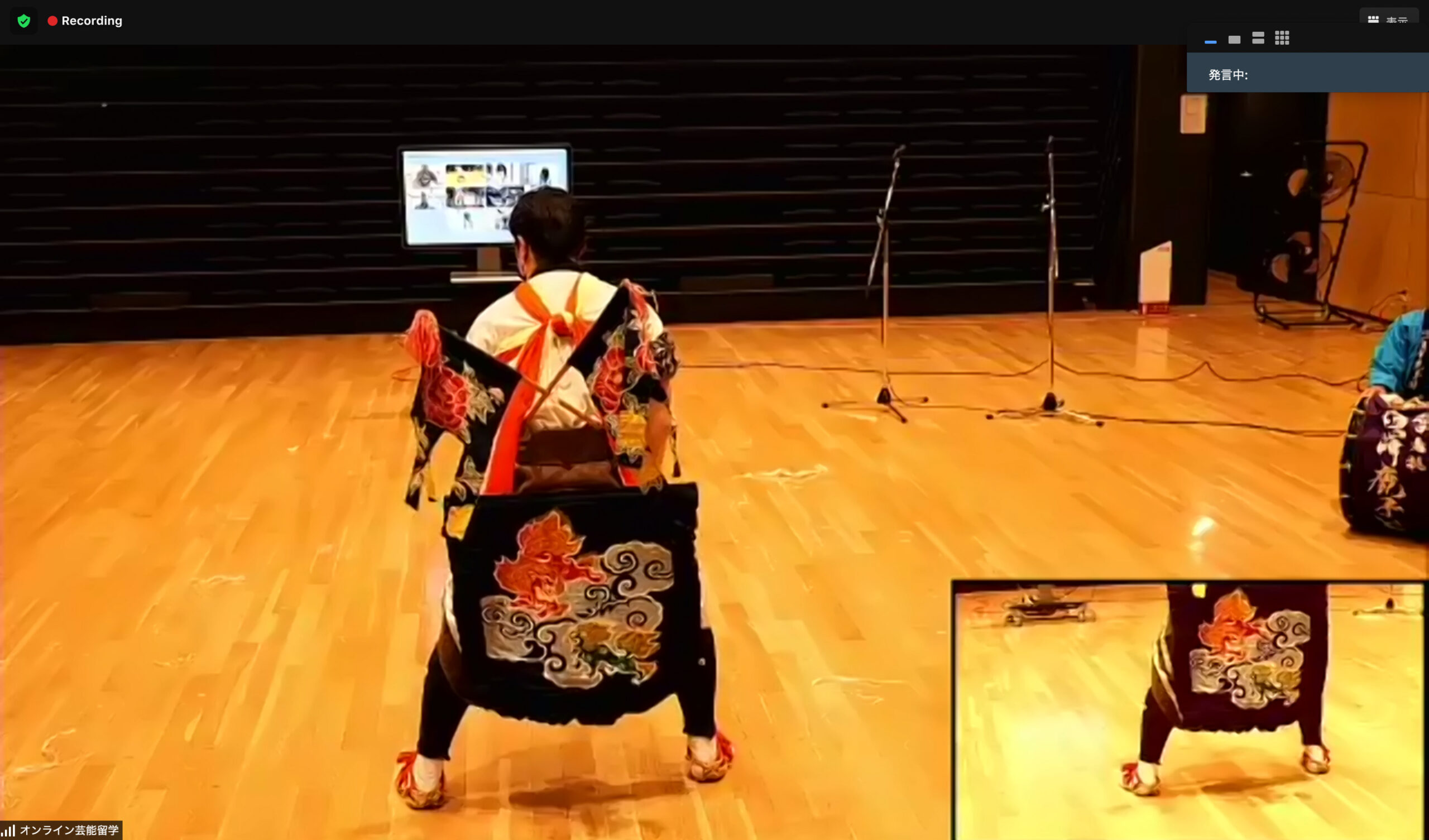 体験には各団体10名の定員が設けられ、郷土芸能に関心のあるアーティストやダンサーなどが参加していた。私自身は普段、踊る機会がないため、少し緊張の面持ちで参加させていただいた。まずは、受講者全員に事前に送っていただいたメールの内容に沿って、15分前にZOOMを立ち上げ音量の調整を実施。事前に音が入っていることを確認しておくことで、受講者も安心して参加することができるのだ。
