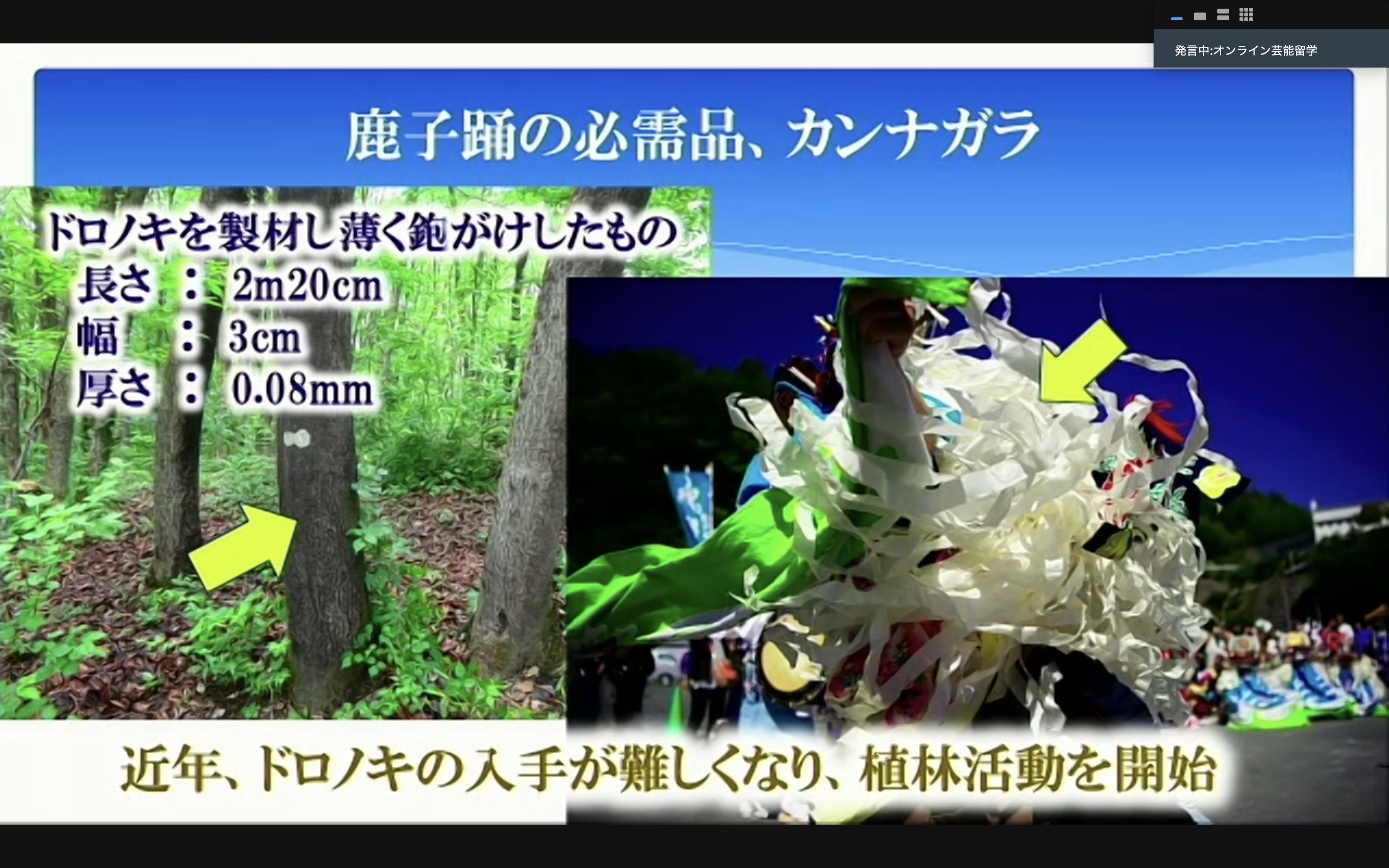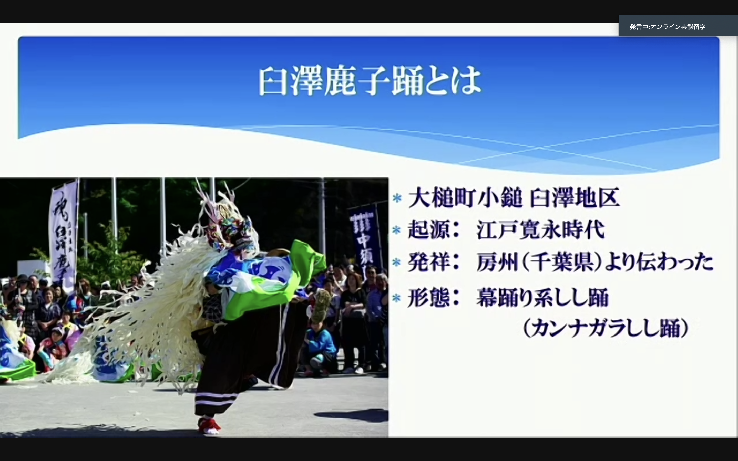 次に臼沢 鹿子踊の起源や歴史、活動内容などをスライドでご説明いただいた。リアルでお話を聞くのと同様に、オンライン上でも問題なく内容が理解できた。話している人の表情を見ながら話を聞くこともできるし、スライドのみの画面にすれば話だけに集中することもできる。場面に応じて画面を切り替えられるのは便利だ。