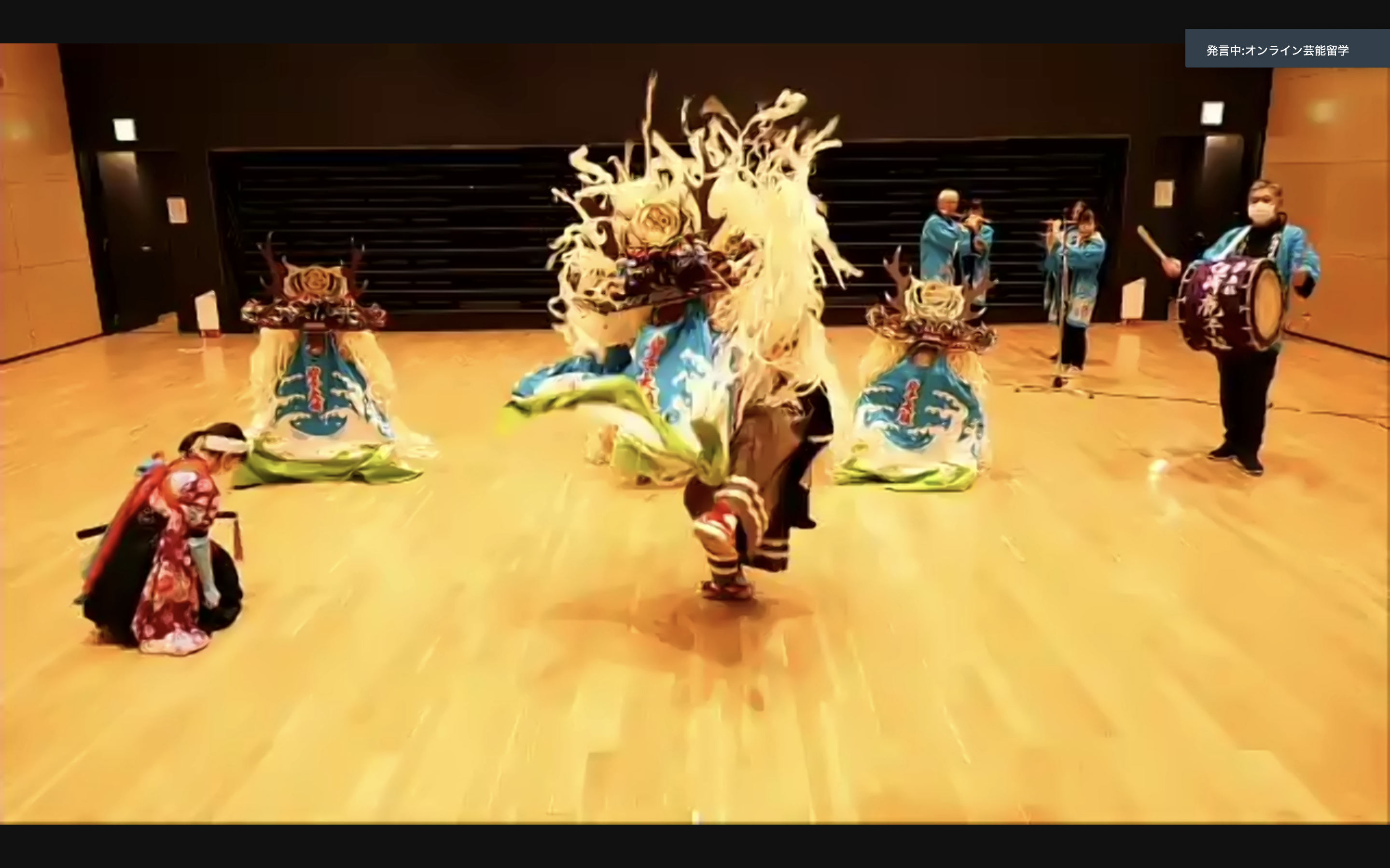 それから顔合わせなどを済ませ、プログラムが開始された。まずはどのような流れで踊るのかを確認すべく、臼澤 鹿子踊の演目を拝見した。大きくてカラフルな衣装が印象的な臼澤 鹿子踊は動いた姿がとても迫力があり、髪の毛の部分(カンナガラ)がぶわっと左右に揺れ動く様がとても神々しく感じられた。オンラインだと現場の空気感を感じることは難しいが、その躍動感が少しでも伝わってきてよかった。