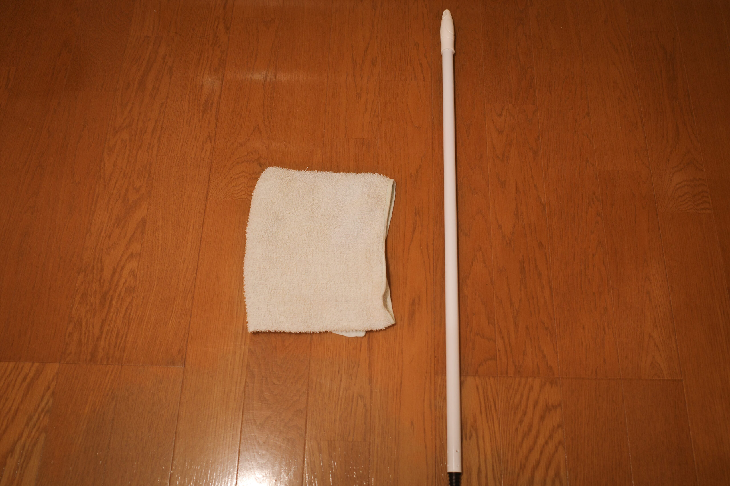 受講生は、シシの幕を持つ感覚を再現するためにタオルと、刀振り用の棒を事前に準備。私は棒がなかなか見つからなかったので、柄が取り外せる箒の柄の部分を用意した。こちらが、私が用意したタオルと棒だ。
