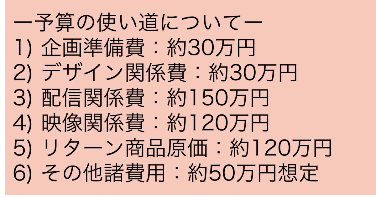 目標募集金額は500万円でAll-in方式で実施する。目標金額に満たない場合も、計画を実行しリターンが届く。目標に近づけば近づくほどオンライン配信クオリティーが上がる仕組みだ。無事開催できるよう、ぜひ皆で応援しよう!