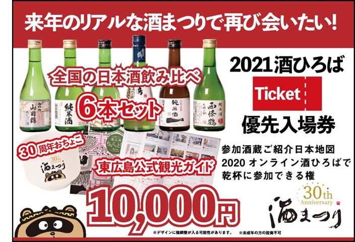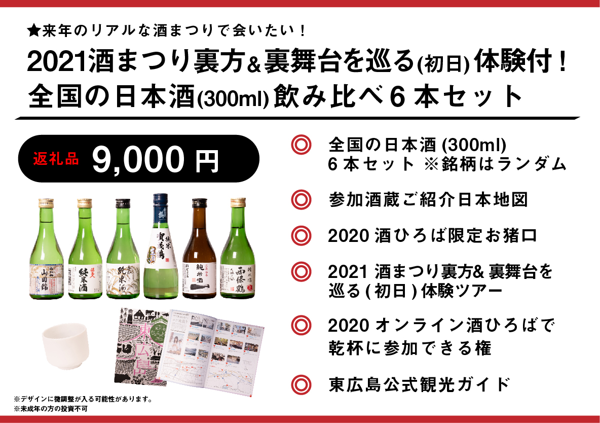 支援コースの特徴として、酒まつりらしく日本全国のご協力いただける酒蔵の地酒(300ml)を集め(現在約350銘柄の予定)、この東広島市の地より全国の日本酒ファンへお届けする。全国の地酒詰め合わせ6本セットにオンラインで参加できる様々な特典がついたものや酒スイーツや応援プロジェクト等、一部を紹介する。