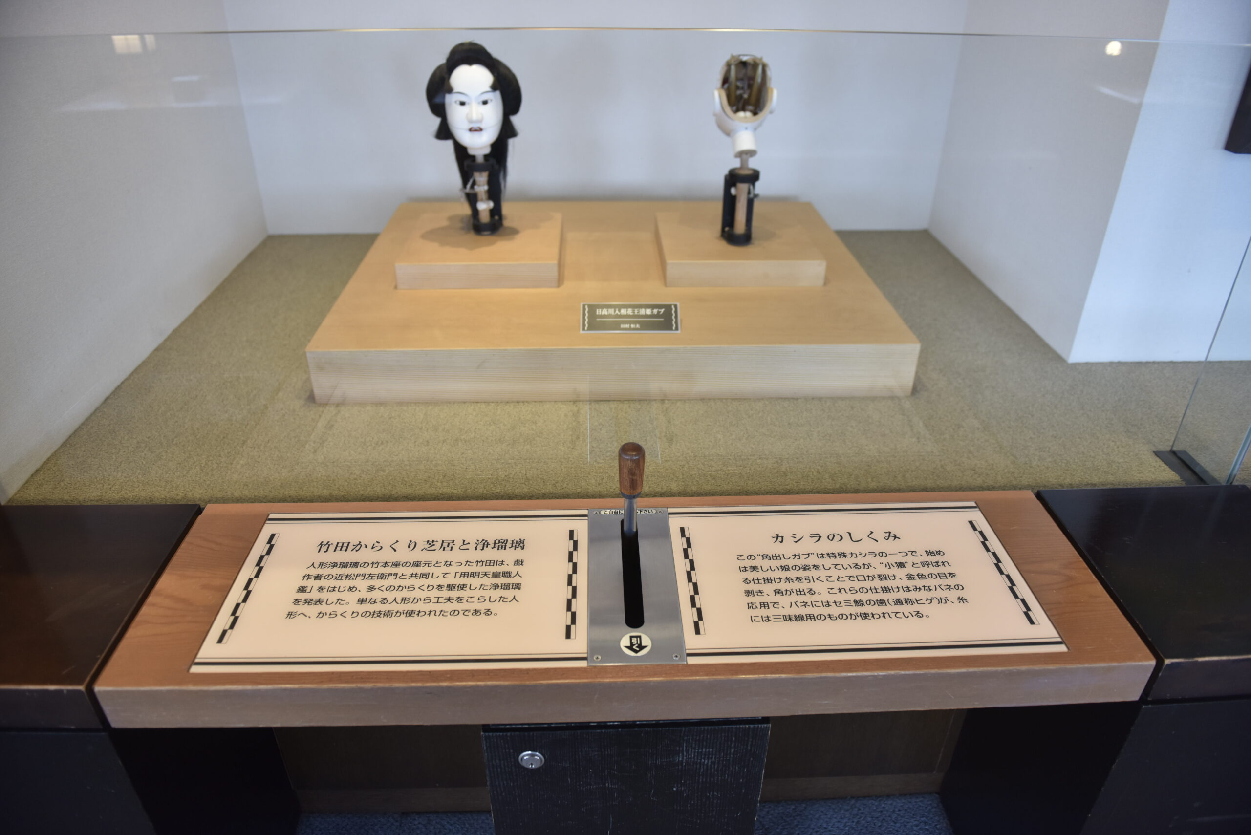 こちらは人形浄瑠璃に使われる人形です。「子猿」と呼ばれる仕掛け糸があり、それを引くことで美しい女の人の表情は一変します。ここでは、手前にあるレバーを引くことで、その表情の変化を楽しむことができます。それでは、恐る恐るレバーを引いてみましょう。