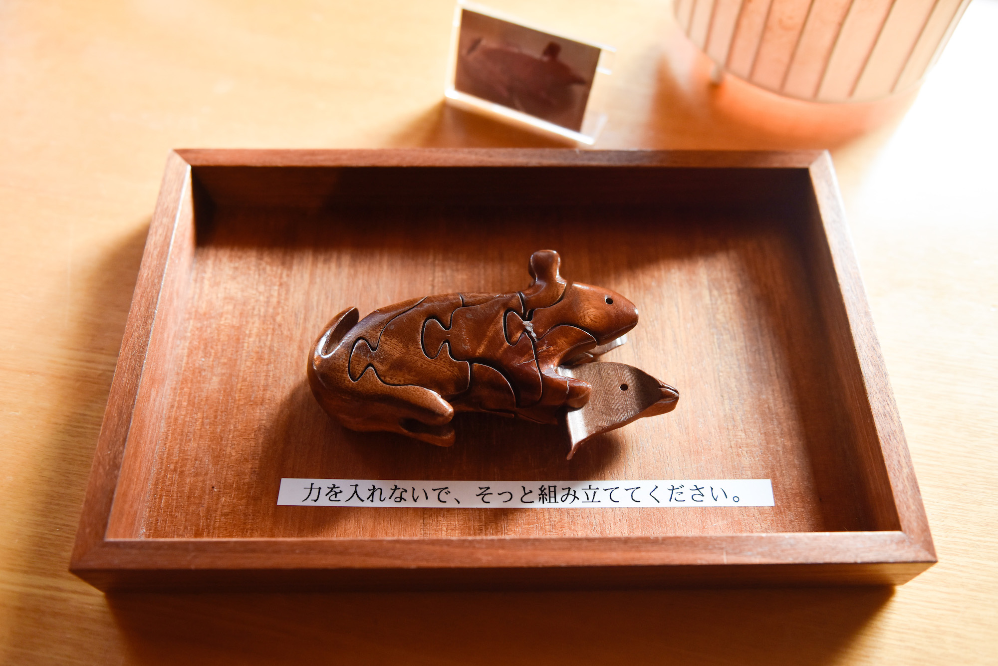 「からくりパズル体験コーナー」では、木の台の上に置かれた作品の仕組みを手を動かしながら読み解いていきます。「パズルを完成させるにはどうしたらいいのだろう?」とか、「木箱を開けるにはどこをいじればよいのだろう?」などと手や頭を動かしているうちに、その仕組みに気づいていくのです。