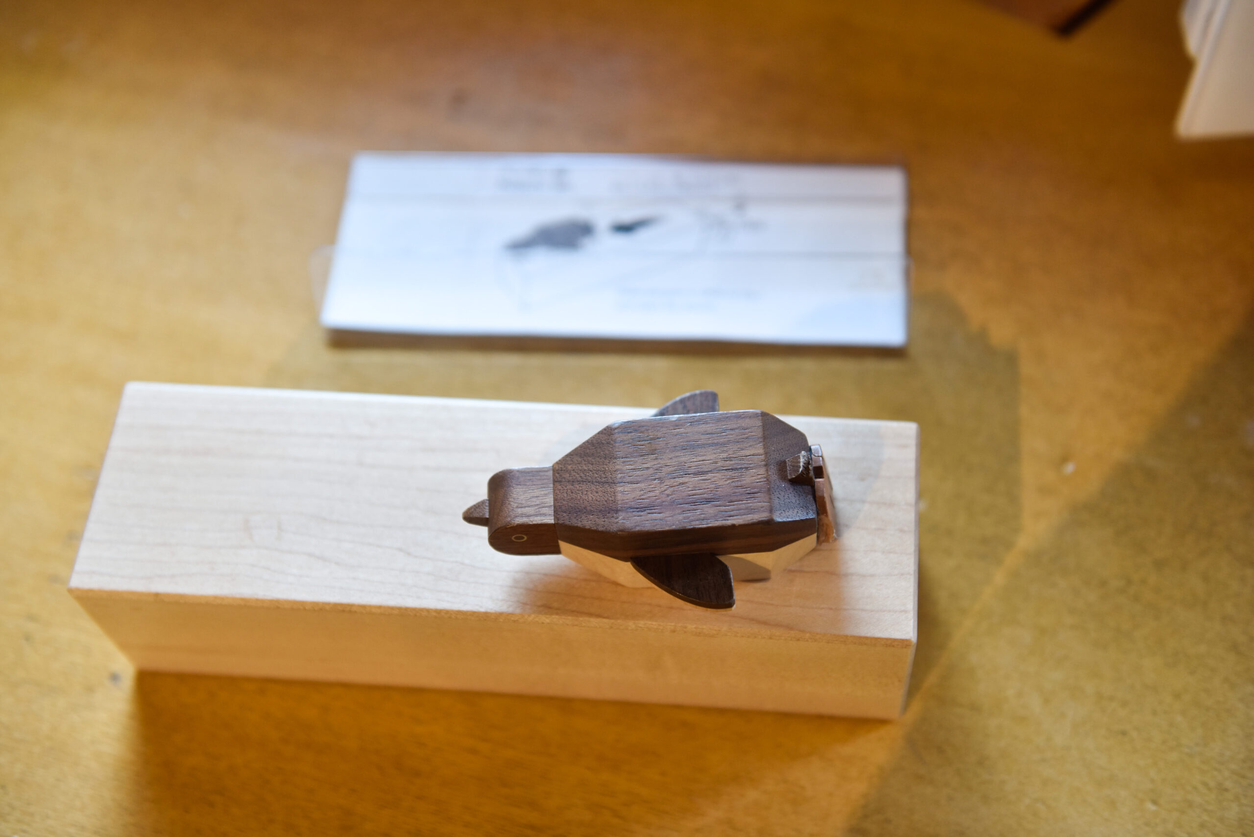 例えばこの作品では、ペンギンを滑らせると、木の箱が開かれるようです。仕組みがわかるとなるほど!と感動します。ペンギンと箱にはマグネットが内部に取り付けられているのです。
