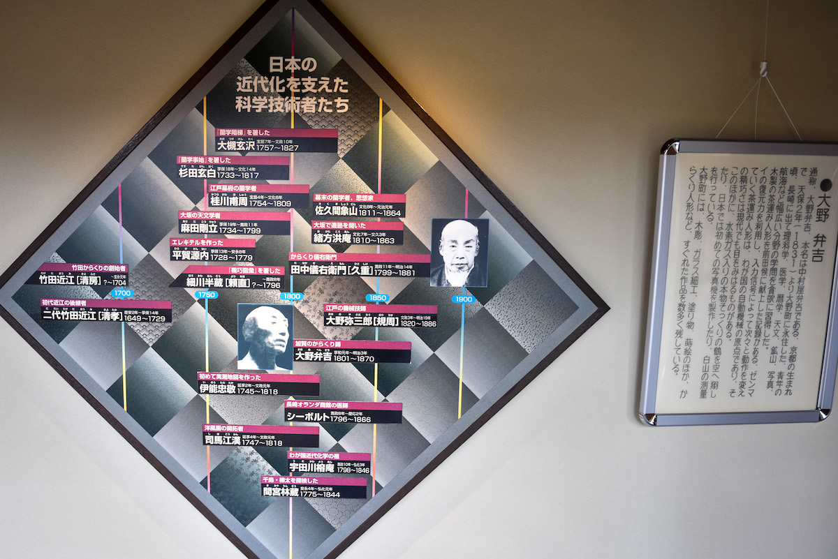 館内に入ると、まずは大野弁吉のプロフィールの紹介がありました。江戸時代の科学者であり、若くして長崎で理化学、医学、天文、暦数、鉱山、写真、航海学を習得した後、結婚を機に30歳で石川郡大野村(現在の石川県金沢市)に移住。木彫、ガラス細工、塗り物、蒔絵、からくり人形などで数々の名作を残しました。これらの名作は当時、最先端の科学知識を活用したもので、現東芝の創業者で「からくり儀右衛門」と呼ばれた田中久重の技術に匹敵するとされ、天才発明家ということで「日本のレオナルドダヴィンチ」とも言われています。大野からくり記念館には、大野弁吉の作品(撮影禁止)のほか、様々なからくりの技術を用いた作品が展示されています。