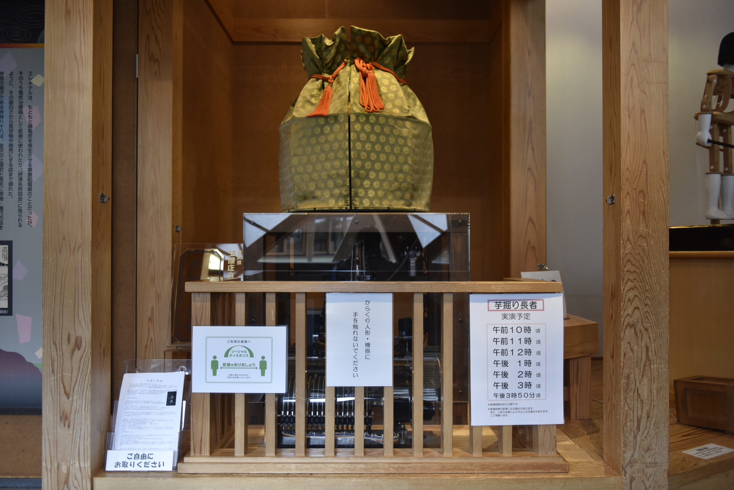 ガタン!という音とともに、からくり人形が動き出して上演が開始。たちまち袋が開かれて、その中にいた芋掘り藤五郎という人物が出てきました。加賀国のお百姓さんです。質素な家に住みながら長者の美しい娘を嫁にもらい、芋掘りをしているときに砂金を掘り当ててお金持ちになる物語でした。椅子に座りながら、物語を聞いていると、とてもほっこりしました。