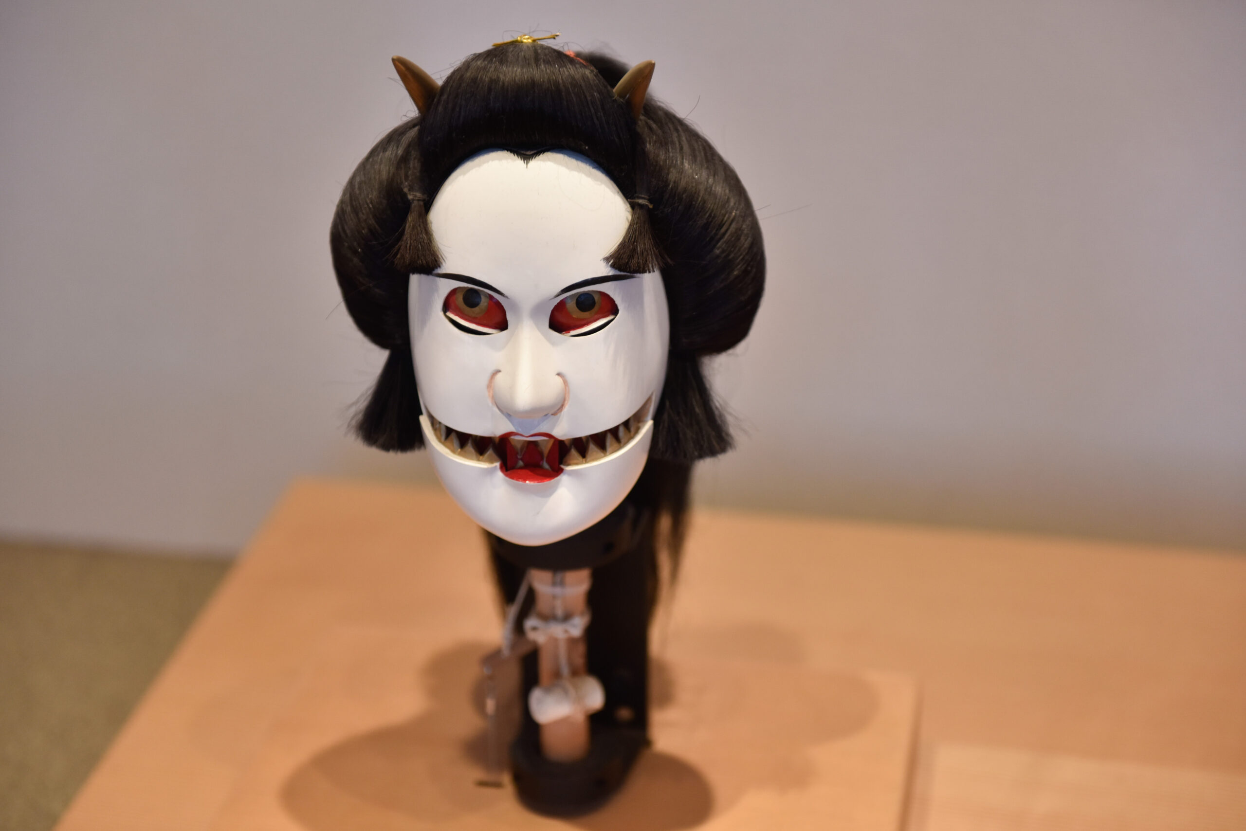 突然、女の人の表情は一変!歯が鋭く口は裂け、金色の目が剥き出しになりました。角も生えていて、ギョッとする表情ですね。子どもがこれを見たらトラウマにならないか心配ですが、とても面白い仕掛けです。表情の変化に用いられているのはバネであり、その素材がなんとセミ鯨の歯とのこと。そのようなものからバネが作られるのか!と二重の驚きがありました。