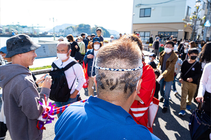 法被を着る保存会の面々の中には、変わったヘアスタイルの人たちも。「シシ」や「神輿」などさまざまな文字が刈り上げで表現されています。お話を聞いたところ、「毎回セルフで刈り上げて、メンバーの中にいるプロが最後に仕上げている」とのこと。こういった髪型からも、保存会の人たちの気合いが伝わってきました。