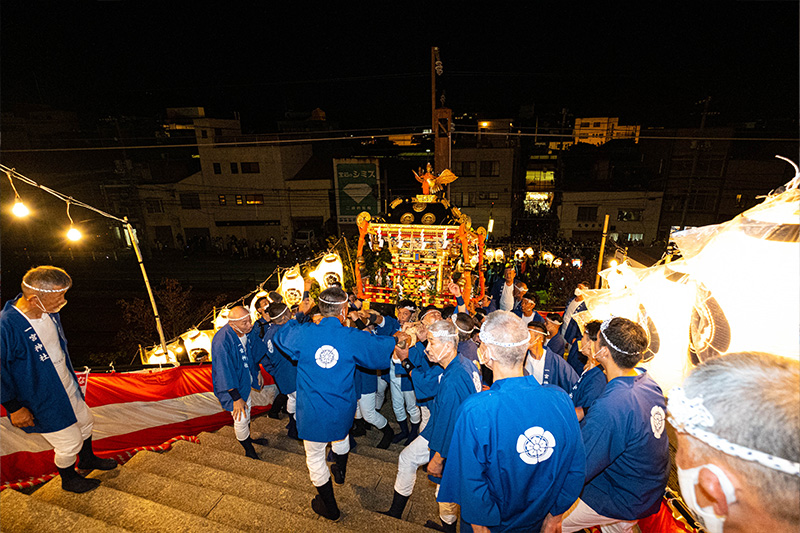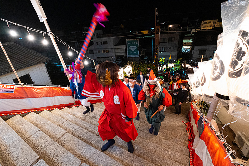 お祭りのクライマックスは、吉備津彦神社です。赤い提灯で照らされた階段を、三鬼神が先導し、その後、御神輿が登ります。多くの人々が見守る中、「こっこじゃあ、こっこじゃあ、ヨイヨイヨイヨイ」というかけ声と共に、何度も御神輿が階段を行き来し、名残惜しそうな姿を見せてくれます。