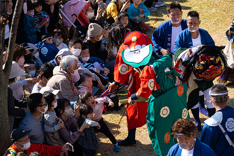 棒でつつかれたり、ささらで叩かれると病気平癒や頭が良くなる、子宝に恵まれるなどのご利益があるといわれているため、大人は進んで小さい子どもを鬼神たちやシシに差し出します。小さい子の大きな泣き声が響き渡る一方で、小学生くらいの子どもたちの中には、自ら三鬼神に絡みに行く子も! スタートから、鬼神たちも観客も全力で向き合っていました。