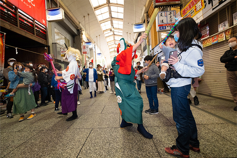 7時半になると商店街の一角にある御旅所に、御神輿と三鬼神とシシ、保存会の面々が集合。早い時間にも関わらず、多くの人たちが見守る中、大きなかけ声やお囃子がアーケードに響き渡ります。早速、子どもたちを追いかけ回す三鬼神とシシ。