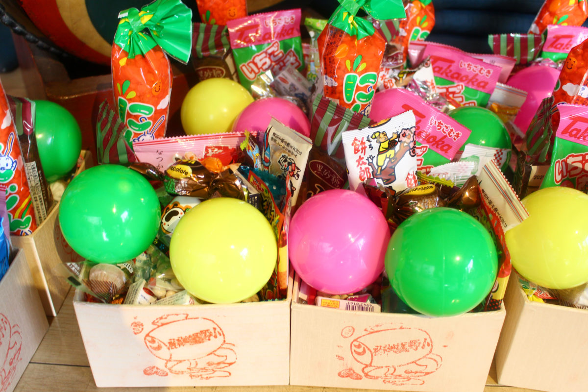 豆と一緒に投げられるお菓子やゴムボールです!カラフルでいろんな種類のものがあって、これは子どもたちもゲットできたら嬉しいですね!