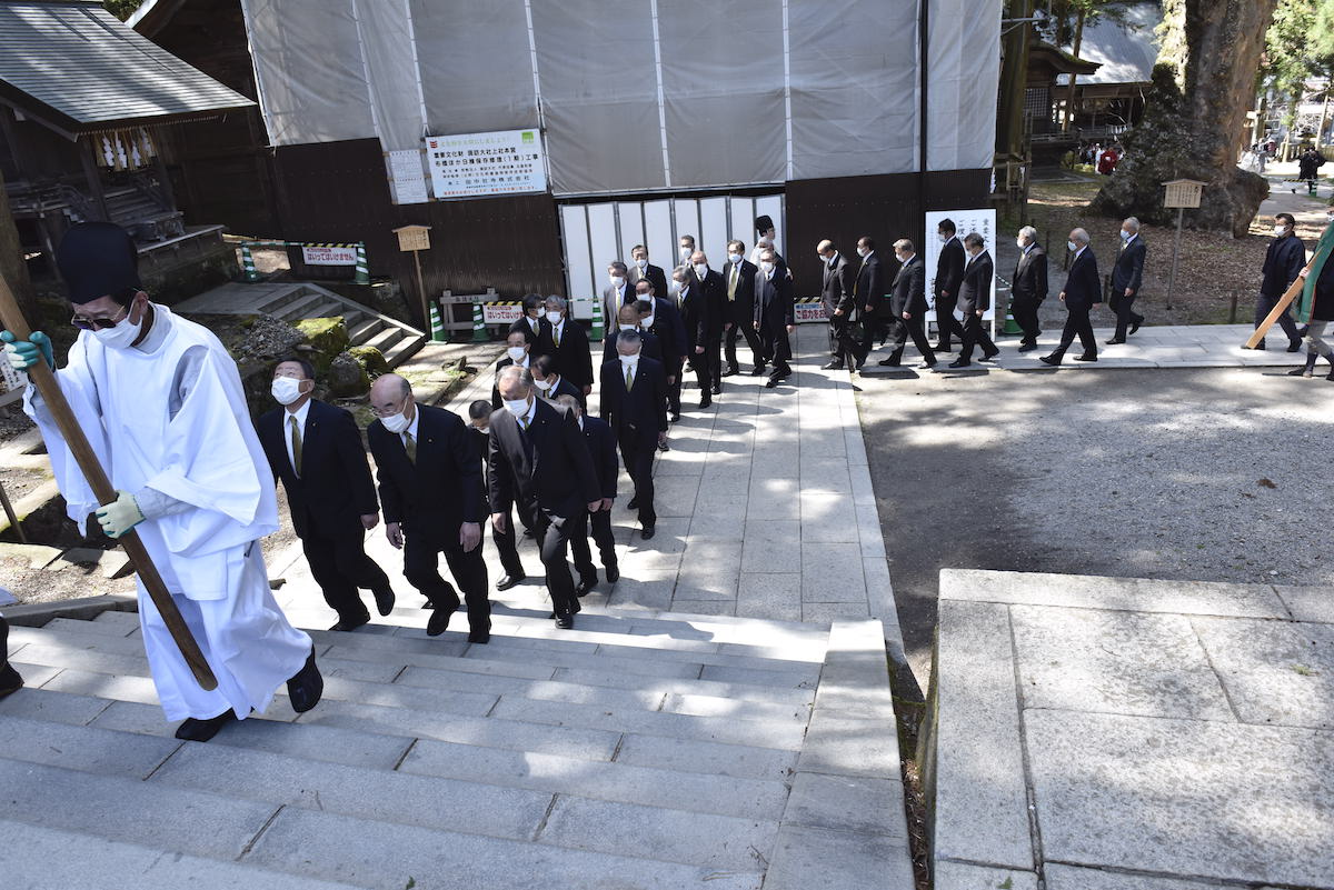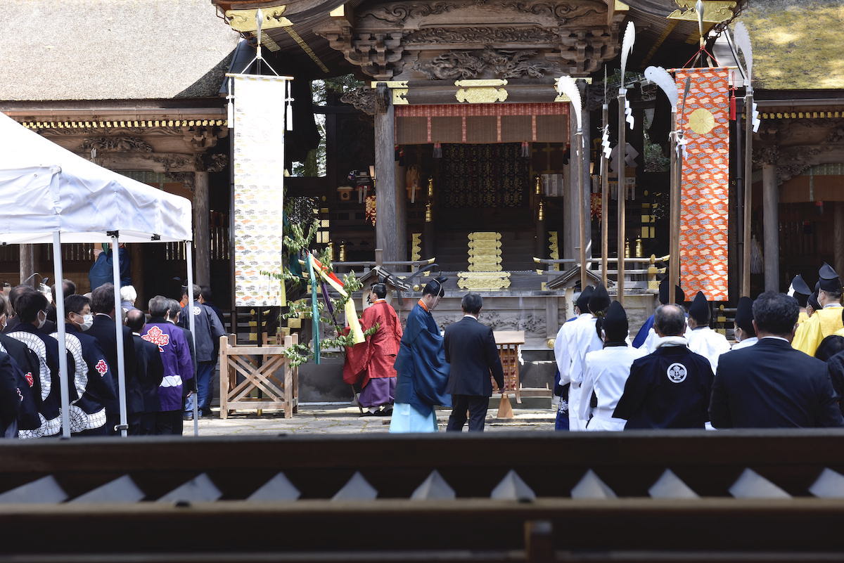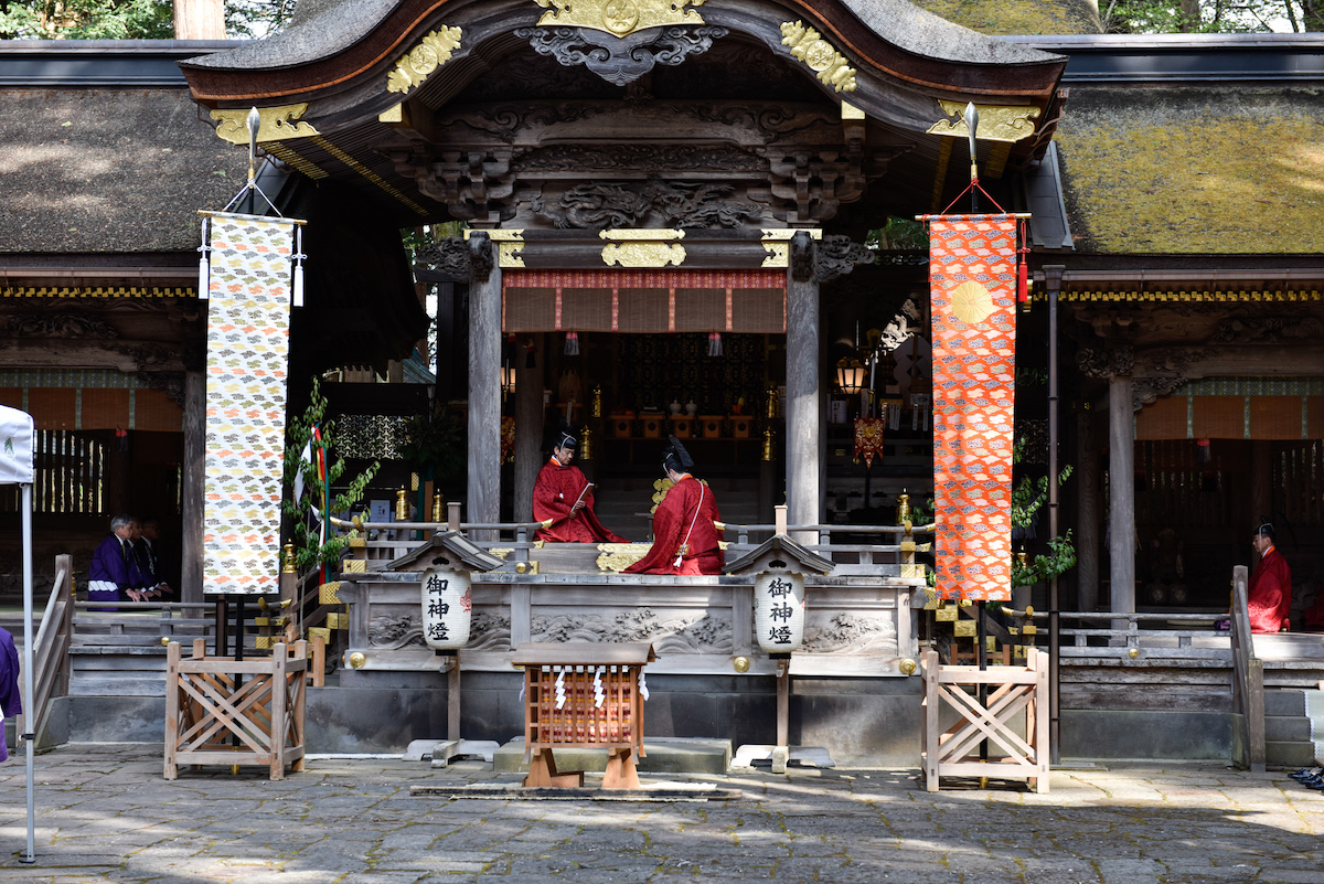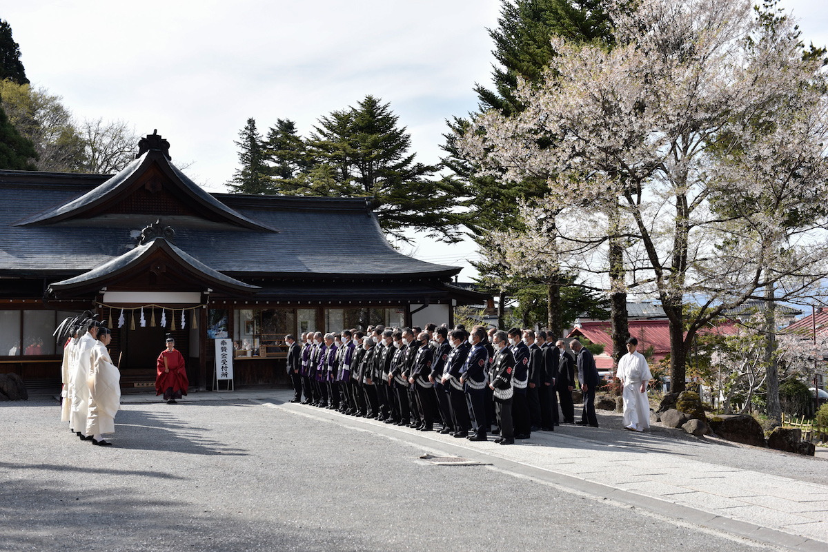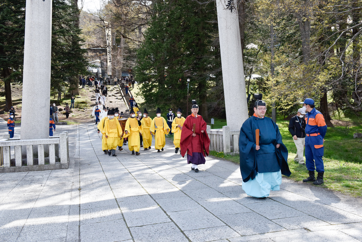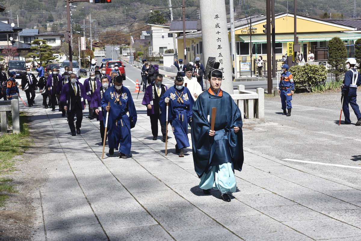 13時ちょうどに上社本宮の拝殿に来ると、すでにもう祭りは始まっていた。列を整え、宮司をはじめとする方々はここらから歩いて上社前宮に向かう。