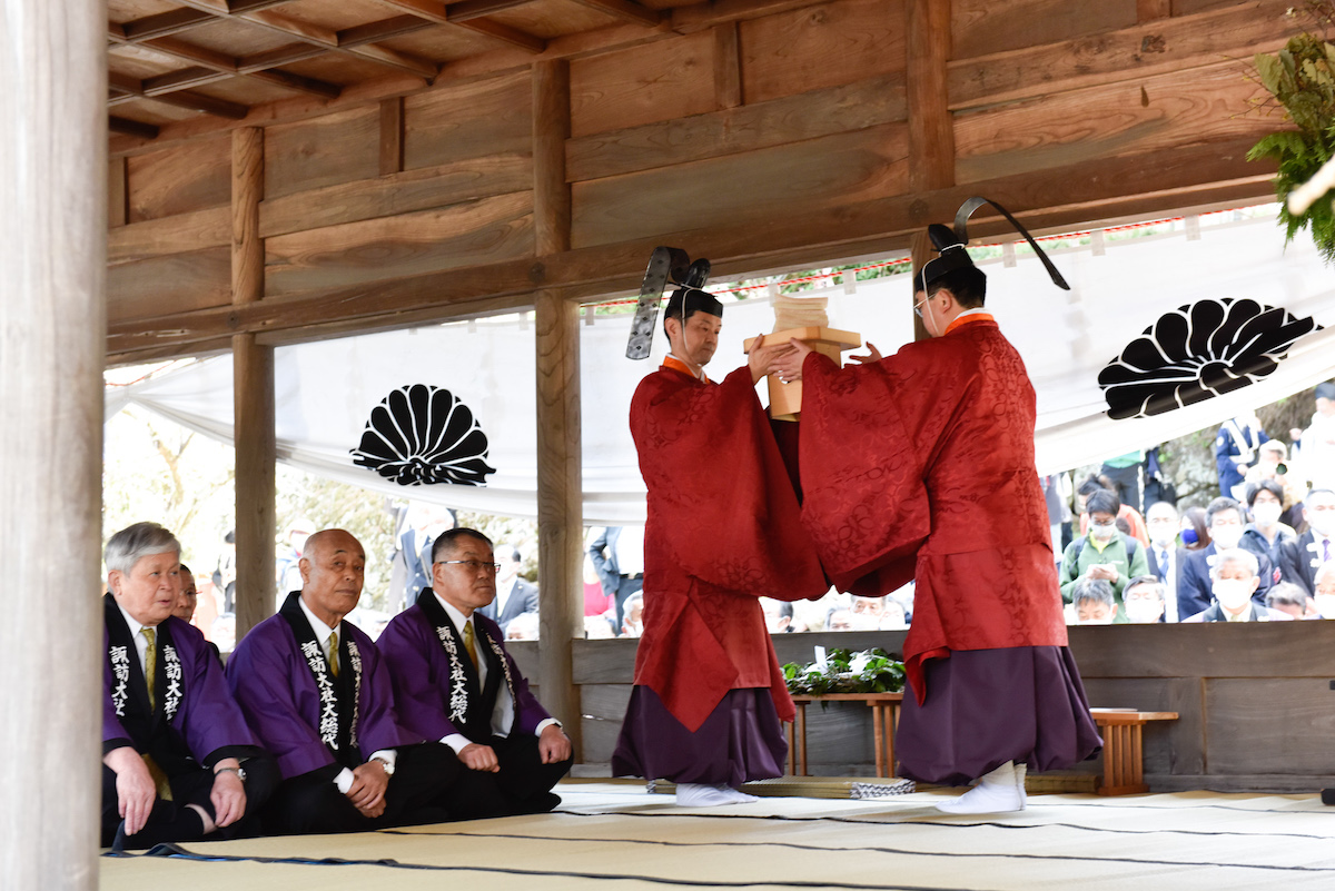 こちらが内御玉殿。ここには、諏訪明神の祖霊が宿るとされている。御頭祭に比べると手短に行われ、内容としてはお供え物をする献饌(けんせん)、祝詞の奏上、玉串を祭壇に捧げる玉串奉奠(たまぐしほうてん)などであった。