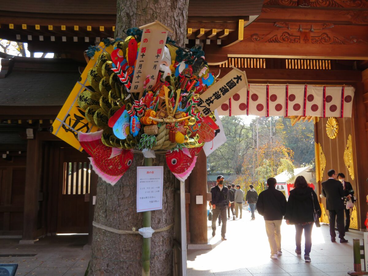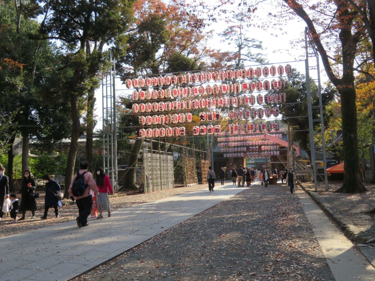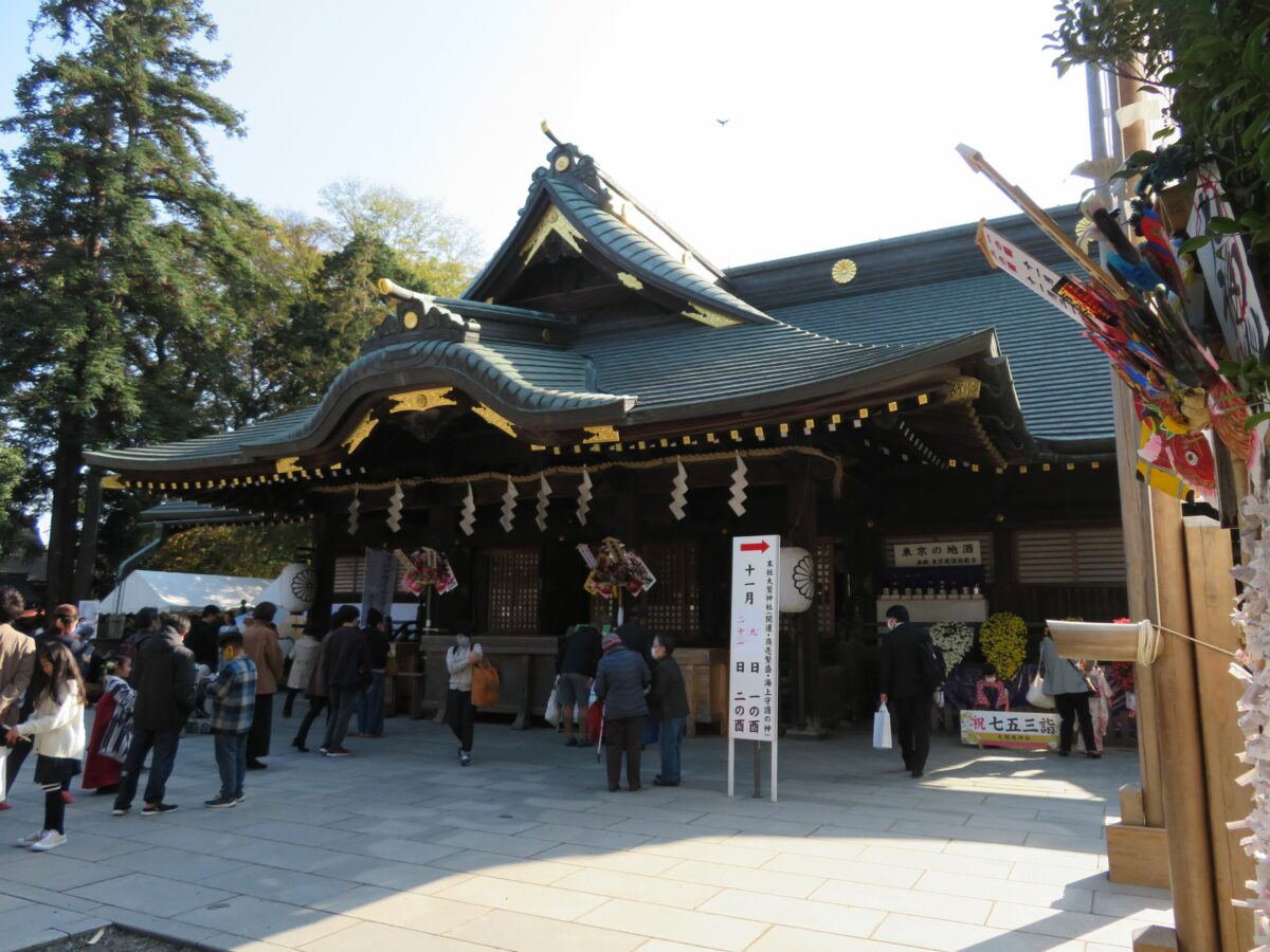 11月には、酉の市、七五三詣、菊花展も開催されます。特に七五三詣に訪れる親子が境内に溢れ、拝殿の周囲には長い行列ができます。境内のあちこちに記念撮影用のスポットが準備されるのです。