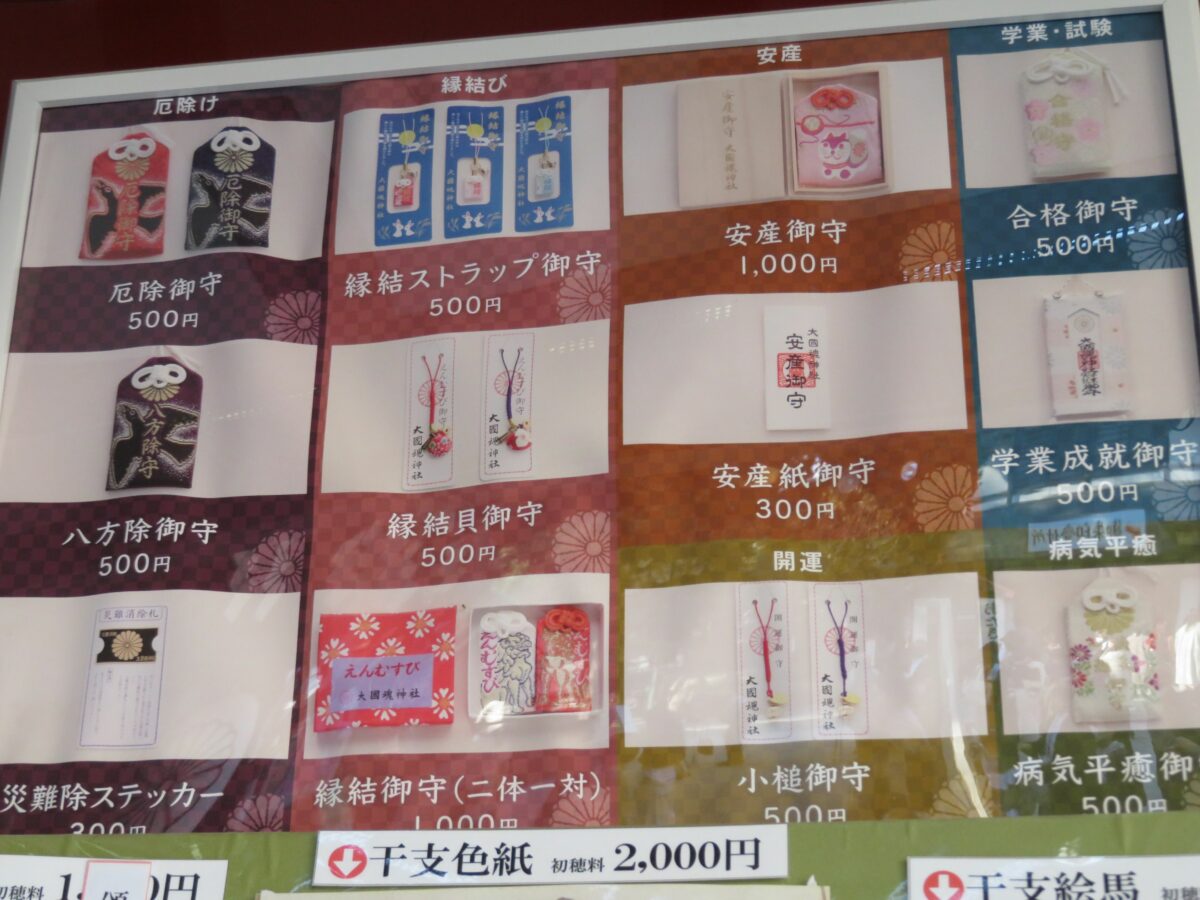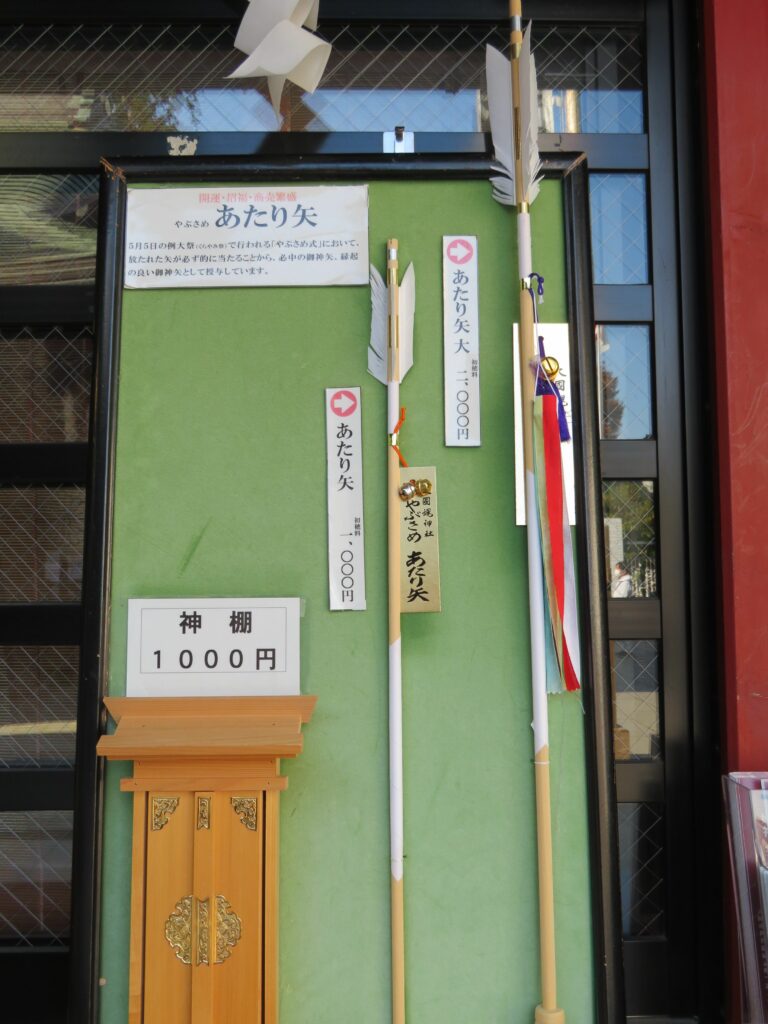 拝殿の西で御朱印受付所に向かい合う授与所では、多種類のお守りや、あたり矢、神棚などの授与品が並んでいます。