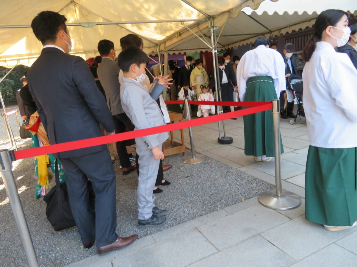 拝殿の周囲に長い行列を作る七五三詣の親子