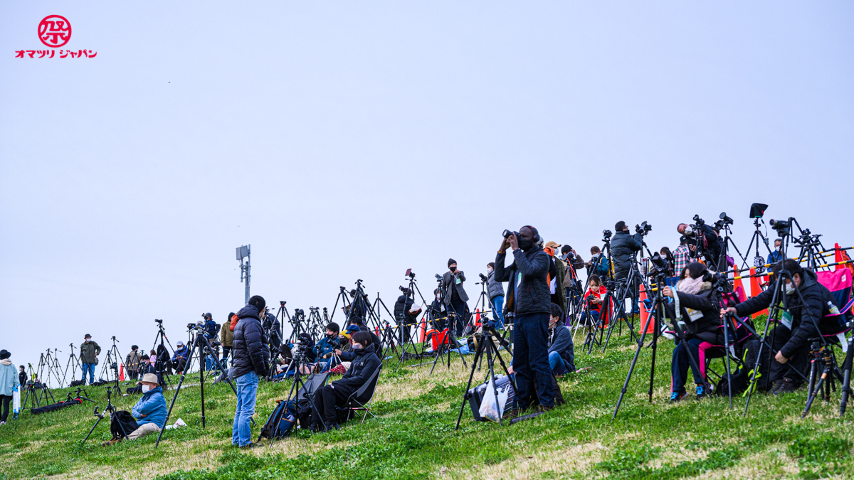 日没前にも関わらず、堤防斜面に設けられたカメラマンエリアは今か今かと花火打ち上げを待ち侘びるフォトグラファーやビデオグラファーたちで大盛況。