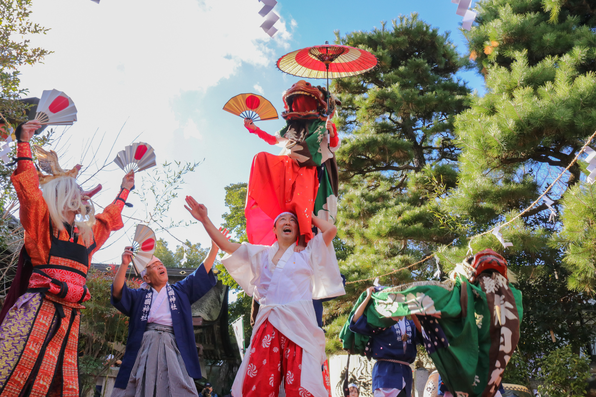 今回は鈴や剣で場を清め、天狗も出てきて最後は祝い唄を歌う、という構成で披露されました。