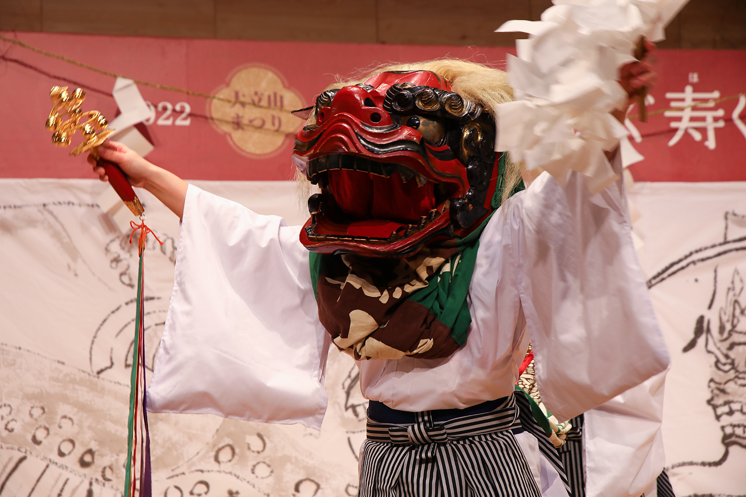 御杖村からは桃俣地区(もものまた)の春日神社「桃俣獅子舞保存会」と、菅野地区の四社神社「菅野の獅子舞」が大立山まつりに参加しています。今回のオンライン配信では桃俣獅子舞保存会の獅子舞が舞台に立ちました。