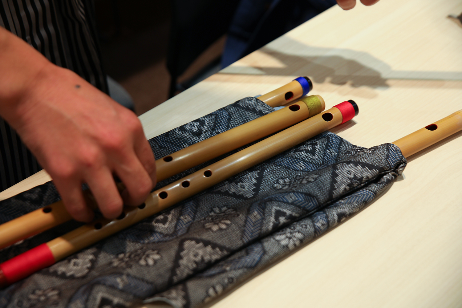 写真:昔ながらの手作りの篠笛。竹に穴を開け、自分専用の笛を使う。