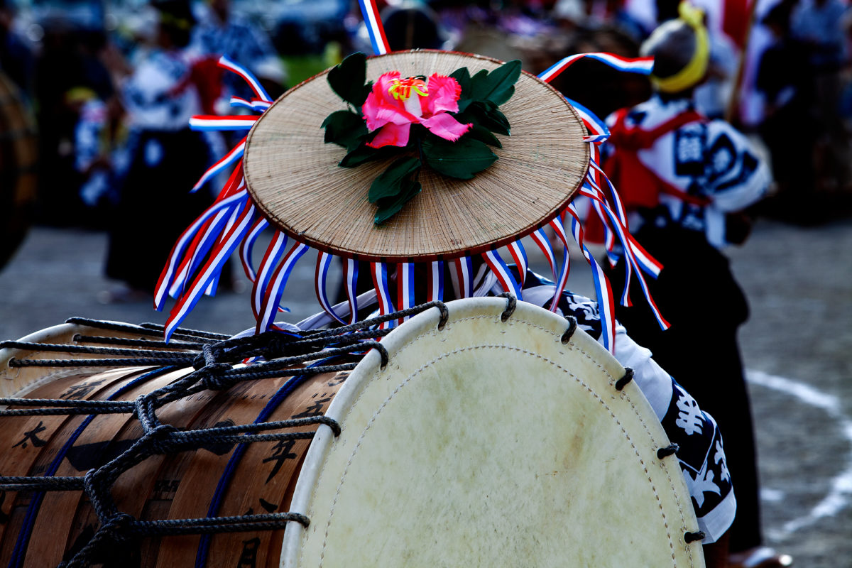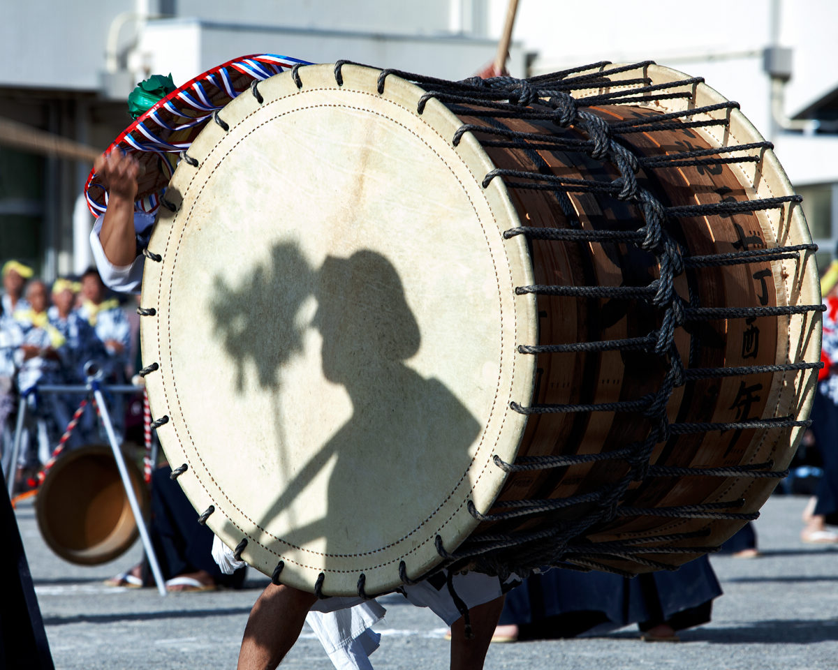 表佐太鼓踊りの魅力は、何と言っても圧倒的に大きい太鼓です。驚くことに直径は1mから1.3m。重さが50kgから60kg。この巨大な太鼓を腹につけ、音頭に合わせて踊りながら太鼓を打つ姿は勇ましく、日々の鍛錬が見ている人の胸を熱くします。