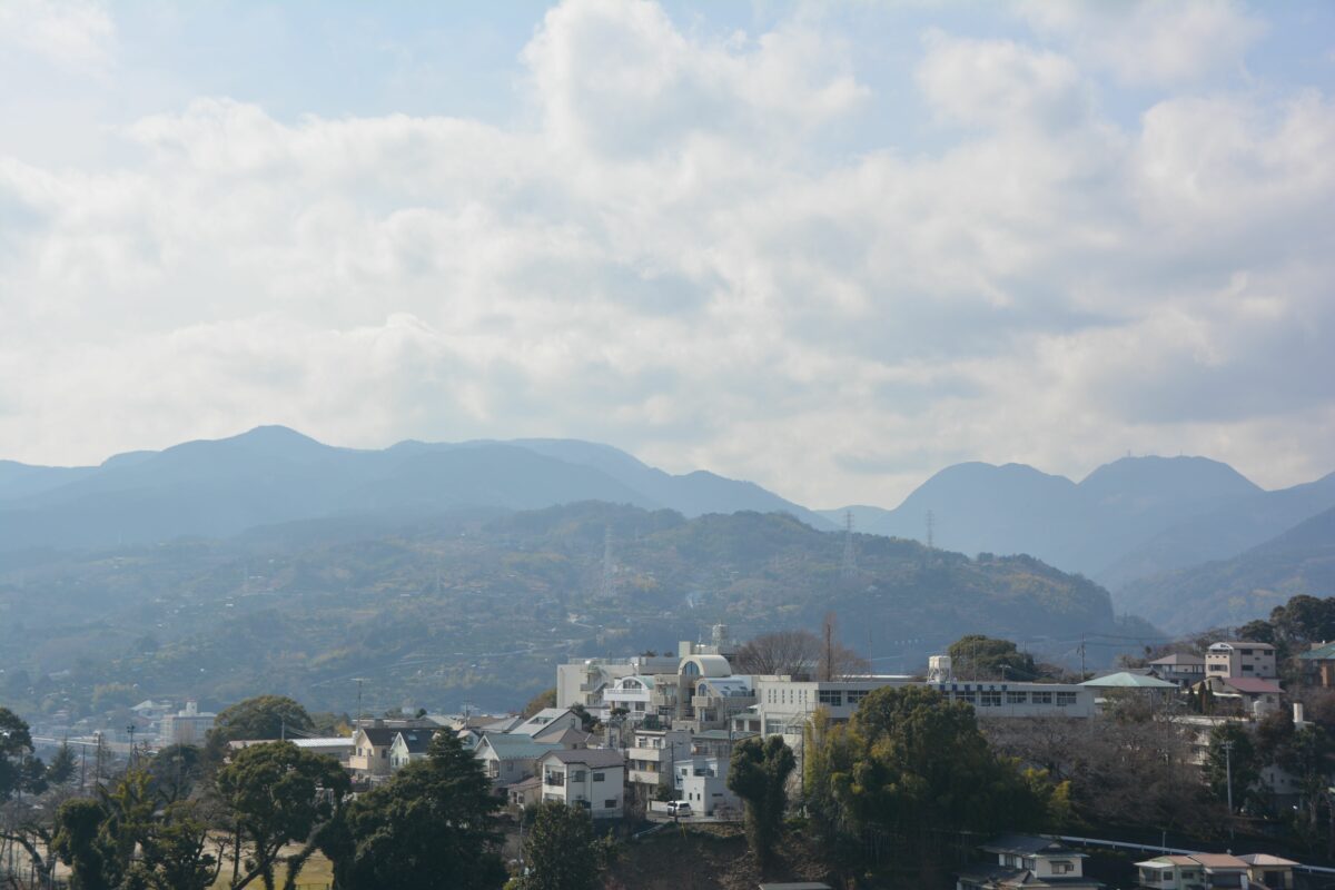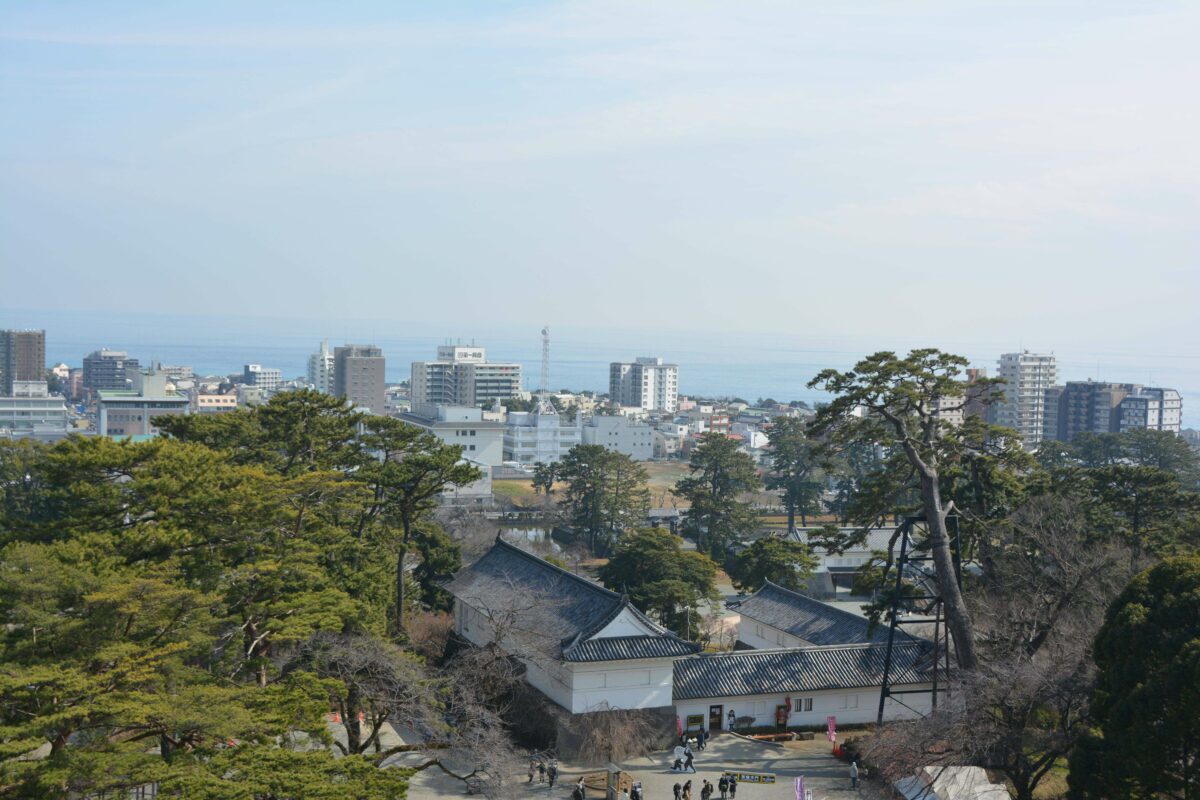 小田原城の天守閣から小田原城址公園越しに眺める相模湾