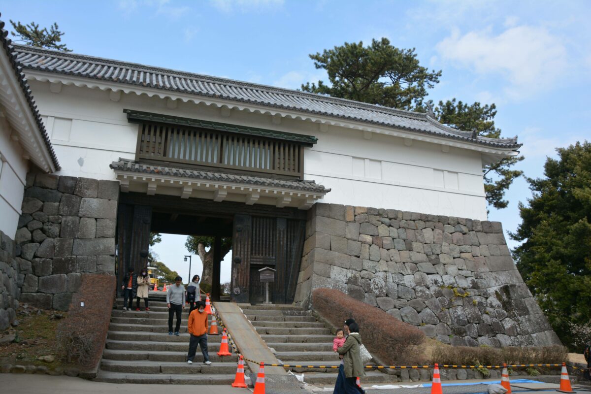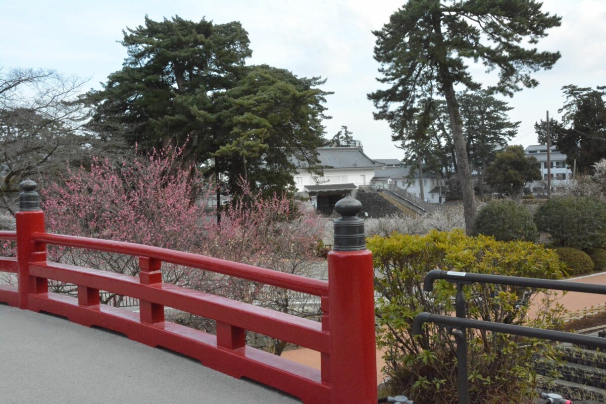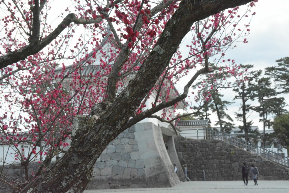 二の丸跡から西の天守閣に向かうと、常盤木門を潜ることになります。本丸の正門の役割を担い、城の防御のため堅固に作られた門の周囲を紅梅が柔らかに包み込んでいます。