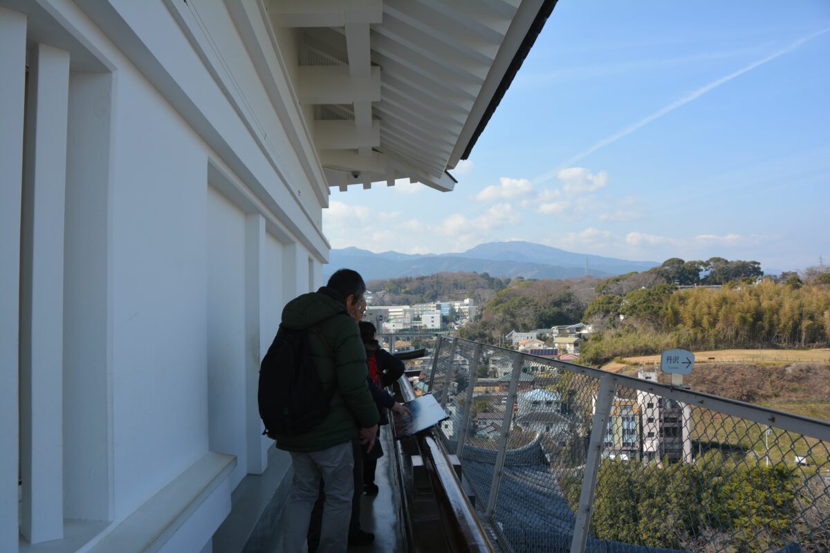 常盤木門を潜って西に進むと本丸広場が広がります。広場越しに3重4階の天守櫓に付櫓、渡櫓が繋がる複合式天守閣が堂々とした姿を見せます。天守閣内では、甲冑、刀剣、絵図、古文書など小田原の歴史を伝える資料が数多く展示されます。海抜約60メートルの最上階からは相模湾を一望することができます。