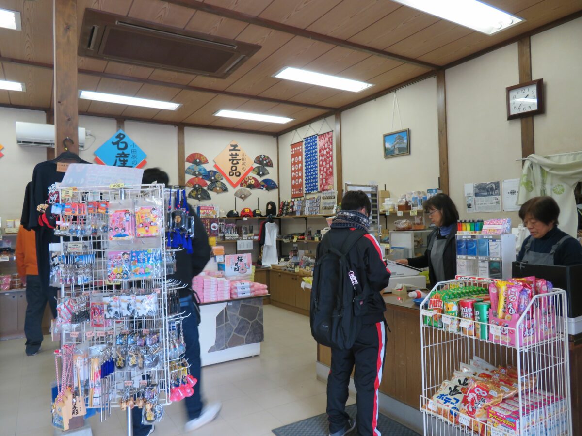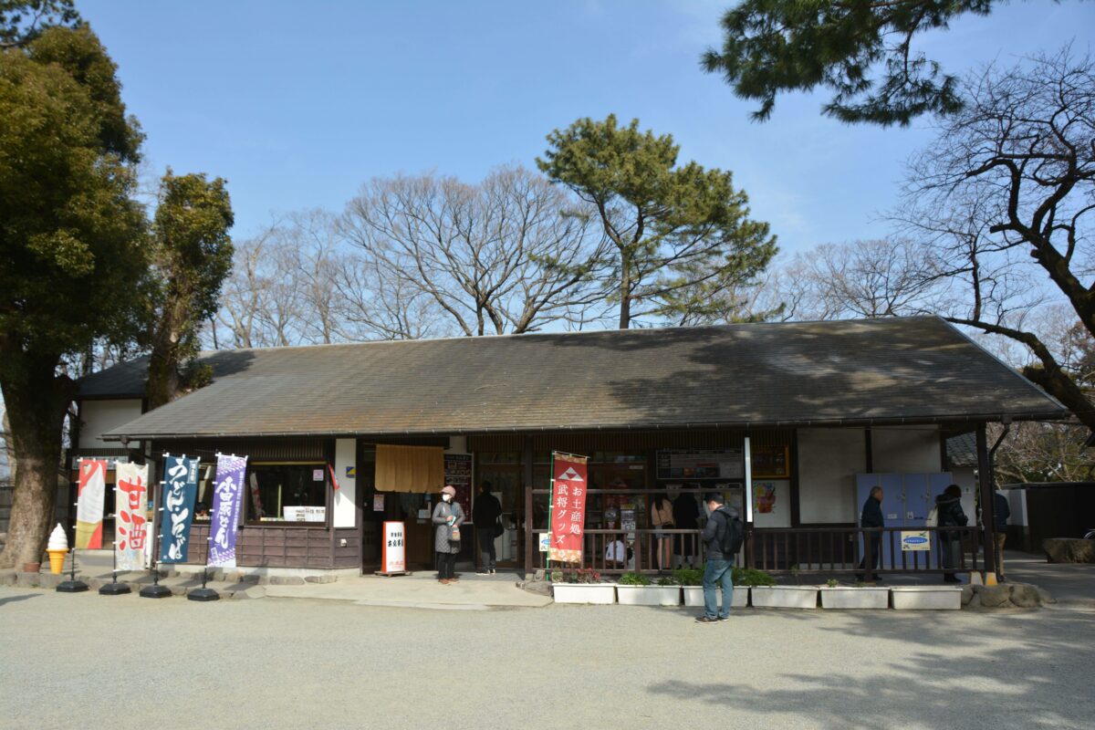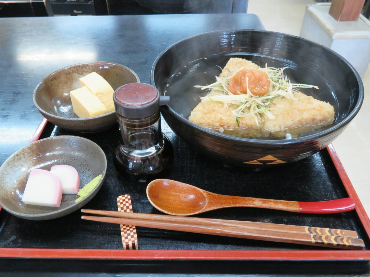 天守閣の下の本丸茶屋・売店では、土産を買い求めることができるばかりでなく、ご当地グルメを味わうことができます。小田原戦国武将の茶漬け丼をイメージした「小田原丼」は1日10食限定です。茶飯のおにぎりに鰹の一番だしを使ったお茶漬け丼で、だしの中にネギやミョウガがトッピングされています。おにぎりの上に乗る幻の「杉田梅」で、クエン酸たっぷりの健康食品です。