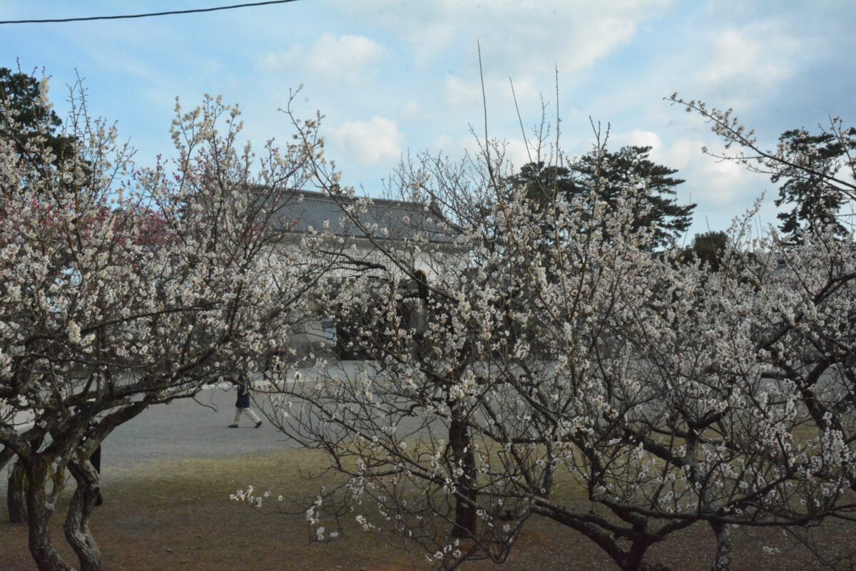 二の丸跡は西側だけではなく南側にも梅が育ち、梅の花越しに銅門(あかがねもん)を見ることができます。