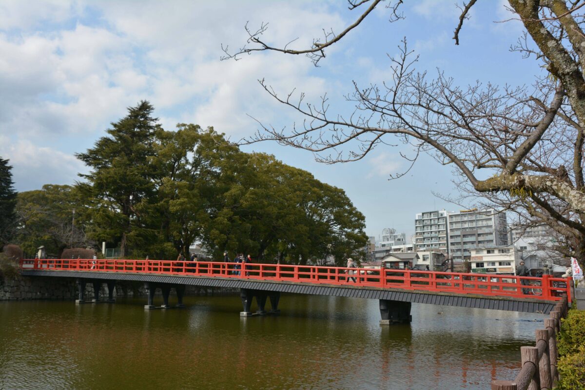 小田原城址公園で梅が植栽されているエリアは天守閣の東、二の丸、常盤木門、銅門の周辺です。小田原駅からお堀端通りを経由し、二の丸東堀に架かる学橋を渡ると二の丸跡です。現在の二の丸跡には建物は残されておらず広場のようになっていますが、西に接する歴史見聞館沿いに梅が並木を作っています。